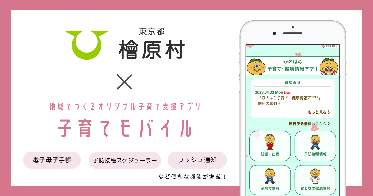 自治体向けサービスを開発する株式会社ミラボ(本社:東京都千代田区、代表取締役:谷川一也、以下「ミラボ」)の子育て支援アプリ「子育てモバイル」が、東京都檜原村に導入され、「ひのはら 子育て・健康情報アプリ」として4月3日より提供を開始しました。