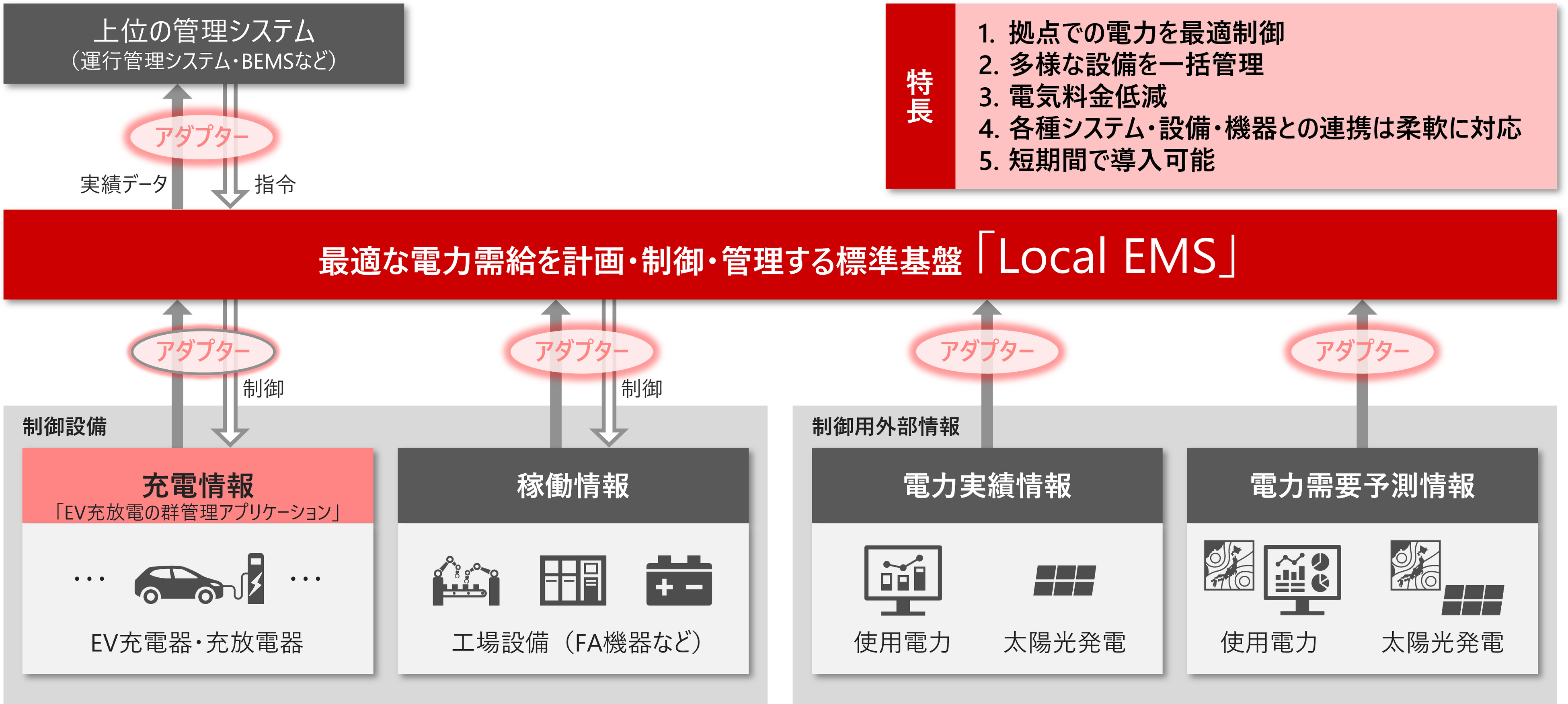 「エネルギーマネジメントシステム構築サービス」は、最適な電力需給を計画・制御・管理する「Local EMS」を標準基盤とし、お客さまのニーズに合わせた、設備・機器と連携するためのアダプターを開発・接続することで、開発コスト低減・短期間での導入を実現します。