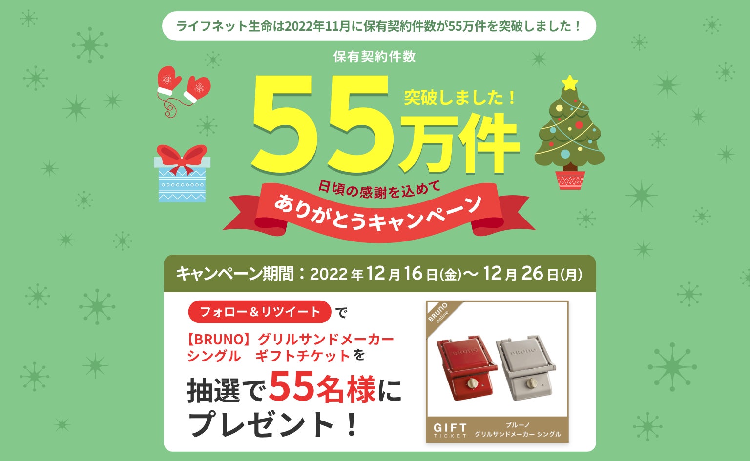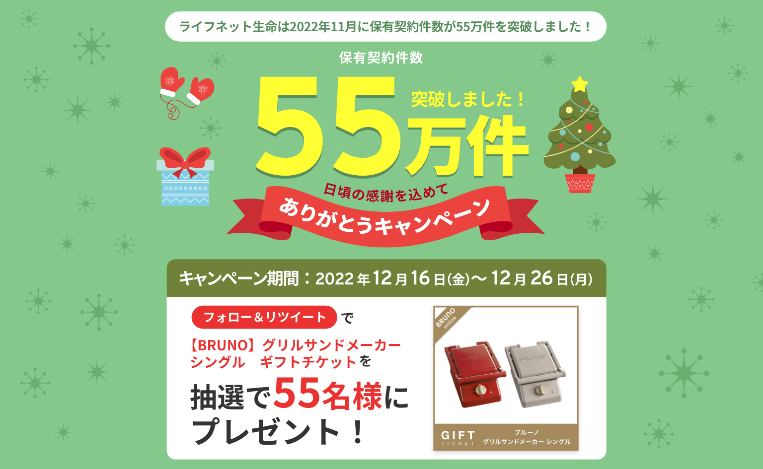 ライフネット生命保険株式会社 (URL:https://www.lifenet-seimei.co.jp/ 本社:東京都千代田区、代表取締役社長:森亮介)は、2022年11月末に保有契約件数が55万件を突破したことを記念して、公式Twitterアカウント(https://twitter.com/lifenetter)にて「55万件ありがとうキャンペーン」を開始したことをお知らせします。