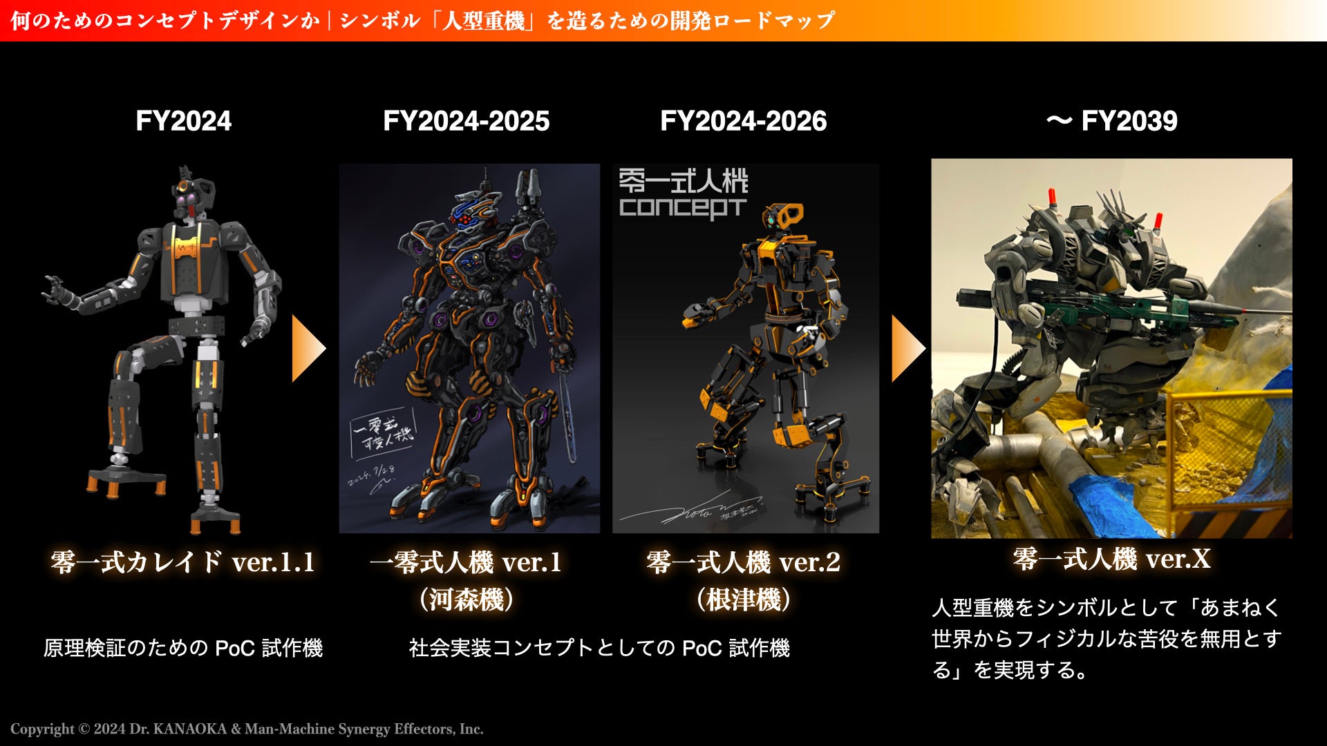 ハードウェアの面では、LOVOT、零式人機等のデザイナー 根津孝太氏 、マクロスシリーズ等のアニメーション監督・デザイナー 河森正治氏と共同開発プロジェクトとして人機一体独自のハードウェア開発を進めてまいります。2024 年度から 2026 年度にかけて各コンセプトデザインをベースとした第一号試作機の開発を目指します。