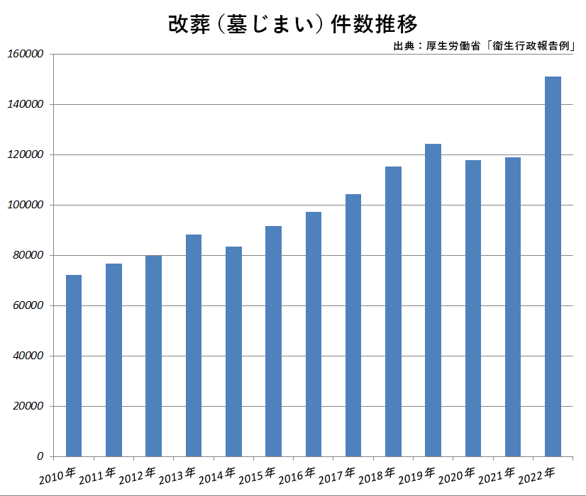 上記のグラフにあるように、近年、改葬(墓じまい)件数は年々増加しています。この背景には、少子化や過疎化の進展により、守る人のいないお墓の増加や、祭祀の後継者の不在といった問題があります。この傾向は今後さらに加速すると見込まれるなか、お墓や供養の将来の不安を解消し、安心できるシニアライフの実現をサポートするため、当社は改葬事業部の体制を刷新いたしました。