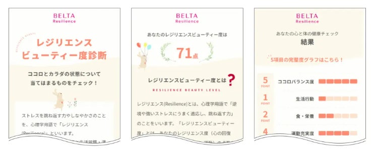 「ベルタレジリエンス」では、40代〜50代の女性が自身のカラダとココロの状態と、その人にあったサポートやアドバイスを知ることができるサービス「ベルタレジリエンスビューティー度診断」をリリースしました。本診断サービスでは、今の自分の状態を知れるだけでなく、結果に応じて管理栄養士や助産師などの専門家に無料で相談いただけます。