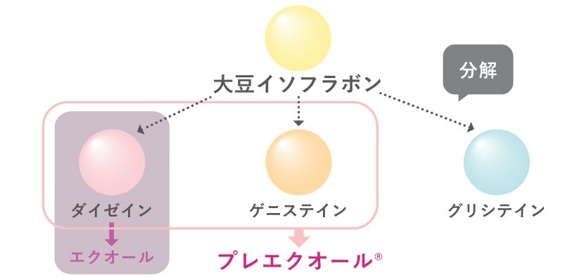 「プレエクオール®」は、エクオールの前駆体である「ダイゼイン」に加え、イソフラボンから変換されるもう1つの成分で女性ホルモンに似た構造を持つ「ゲニステイン」、2つの成分が合わさった女性に嬉しい成分です。