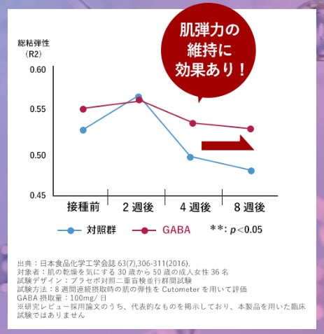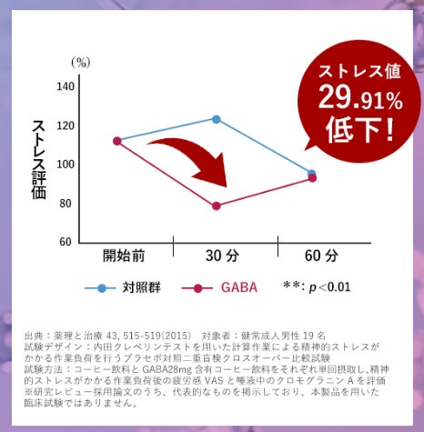※1:自社調べ。GABA(γ-アミノ酪酸)を機能性関与成分とした機能性表示食品の中で、機能性関与成分GABA(γ-アミノ酪酸)とその他成分プレエクオール®(大豆イソフラボンアグリコンとして)を日本で初めて配合。消費者庁機能性表示食品届出情報検索にて(2024年2月14日時点)