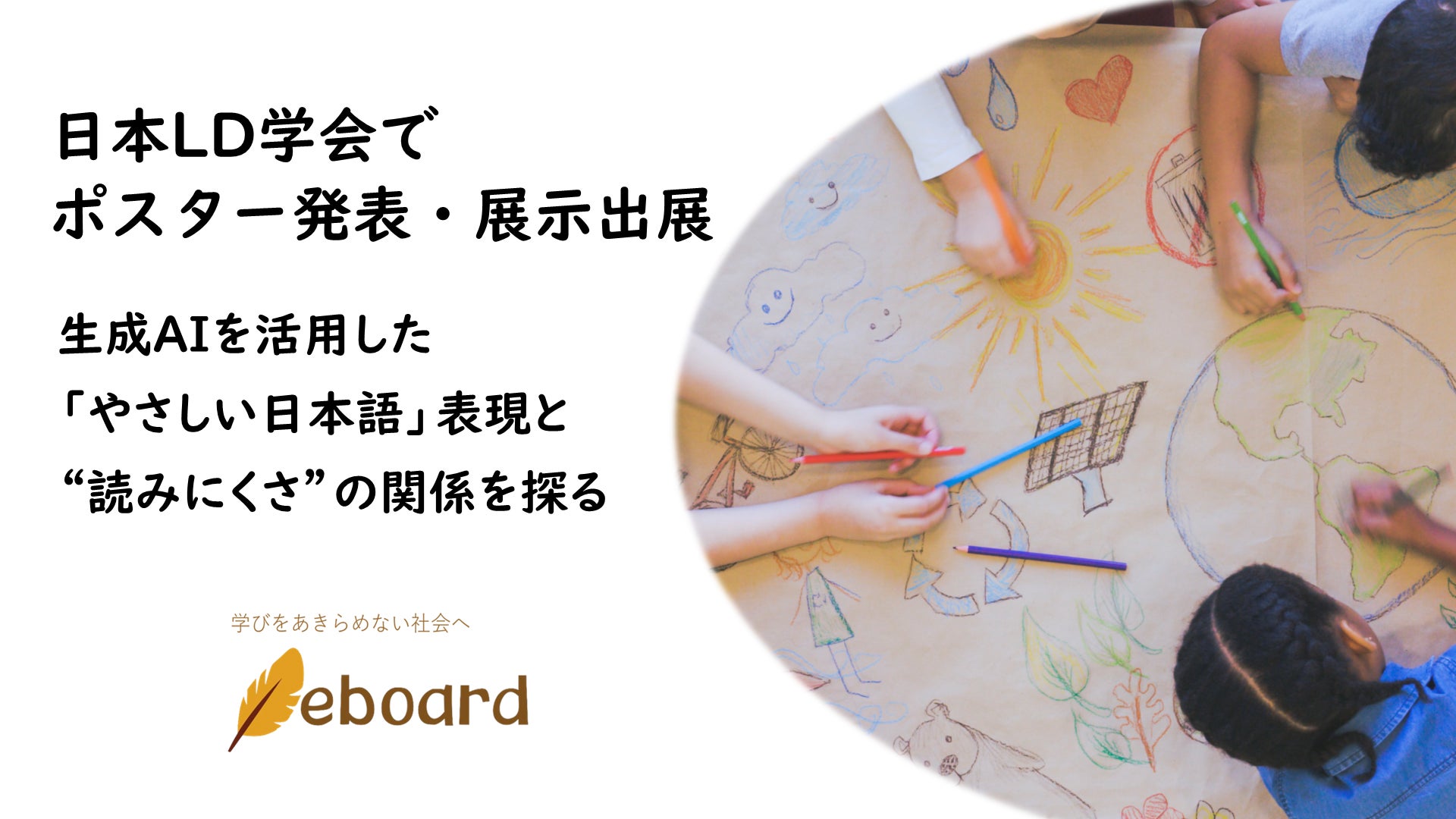 NPO法人eboard(イーボード)は、2025年10月18日(土)~19日(日)に国立オリンピック記念青少年総合センターで開催される「一般社団法人 日本LD学会 第34回大会」において、早稲田大学の髙橋麻衣子先生と共同で、生成AIを活用した「やさしい日本語」表現と成人の”読みにくさ”の関連性をテーマにポスター発表を行います。