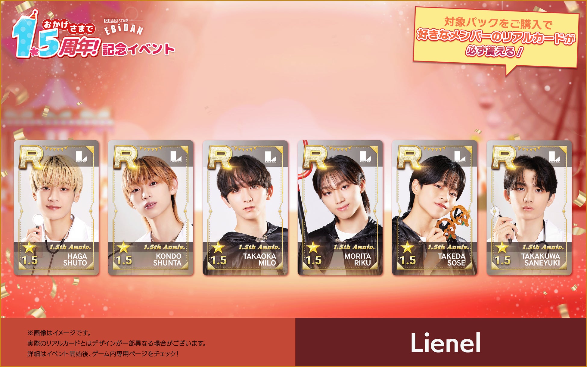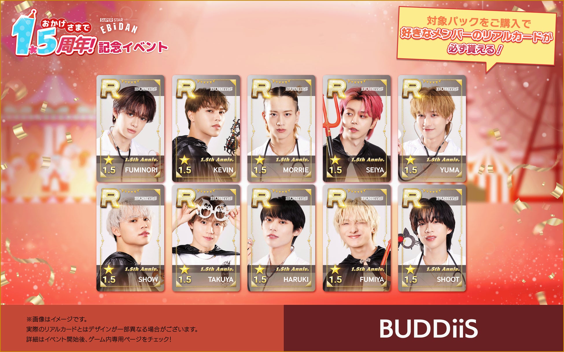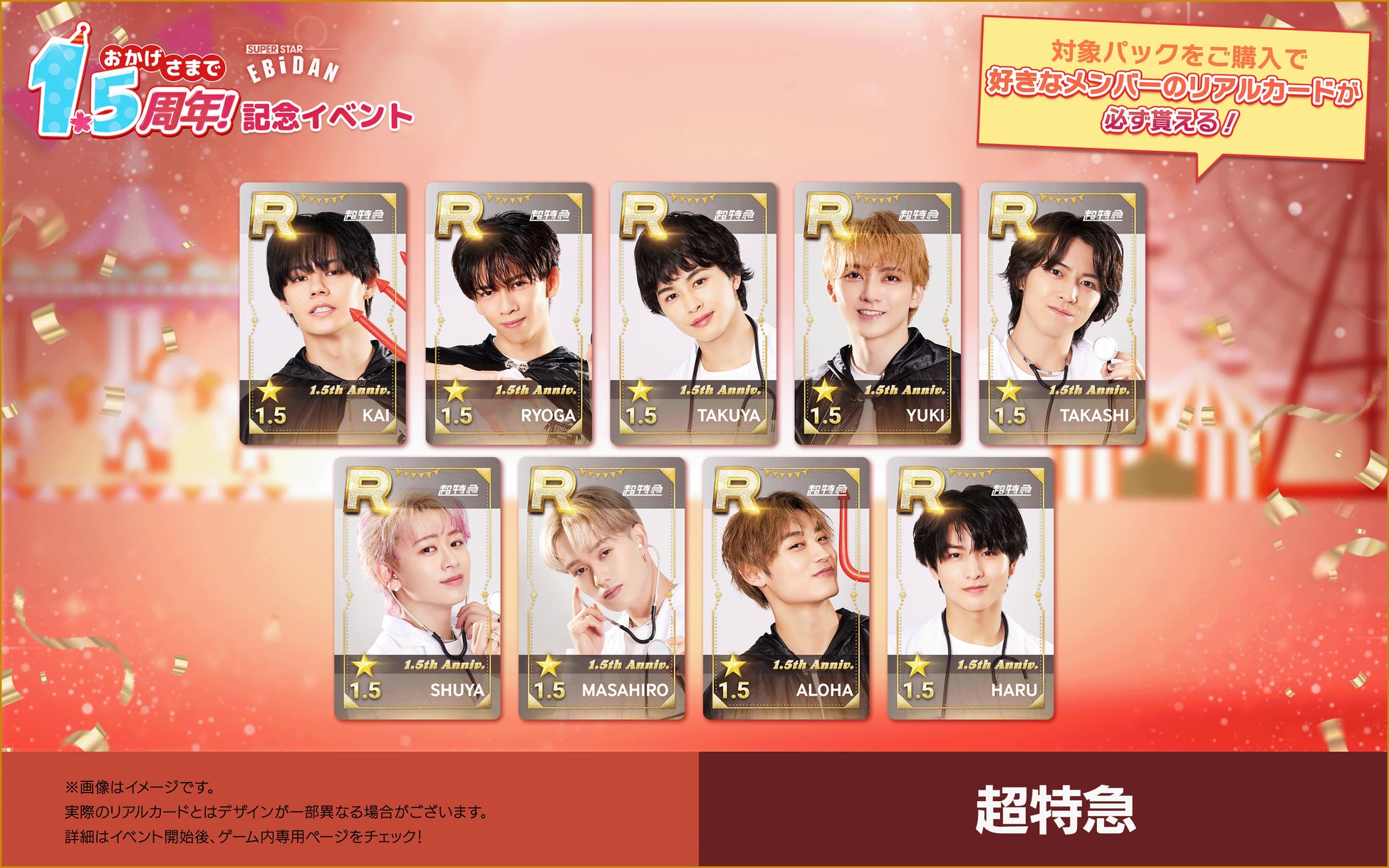 株式会社DalcomSoft Japanは、スターダストプロモーションに所属する超特急やM!LKなど、多数の人気ボーイズグループが所属する若手アーティスト集団・EBiDANの公式リズムゲームアプリ『SUPERSTAR EBiDAN』にて、本日(2025年4月24日)からサービス開始1.5周年を記念して推しのリアルカードが必ず交換できるパックの販売を開始したことをお知らせいたします。