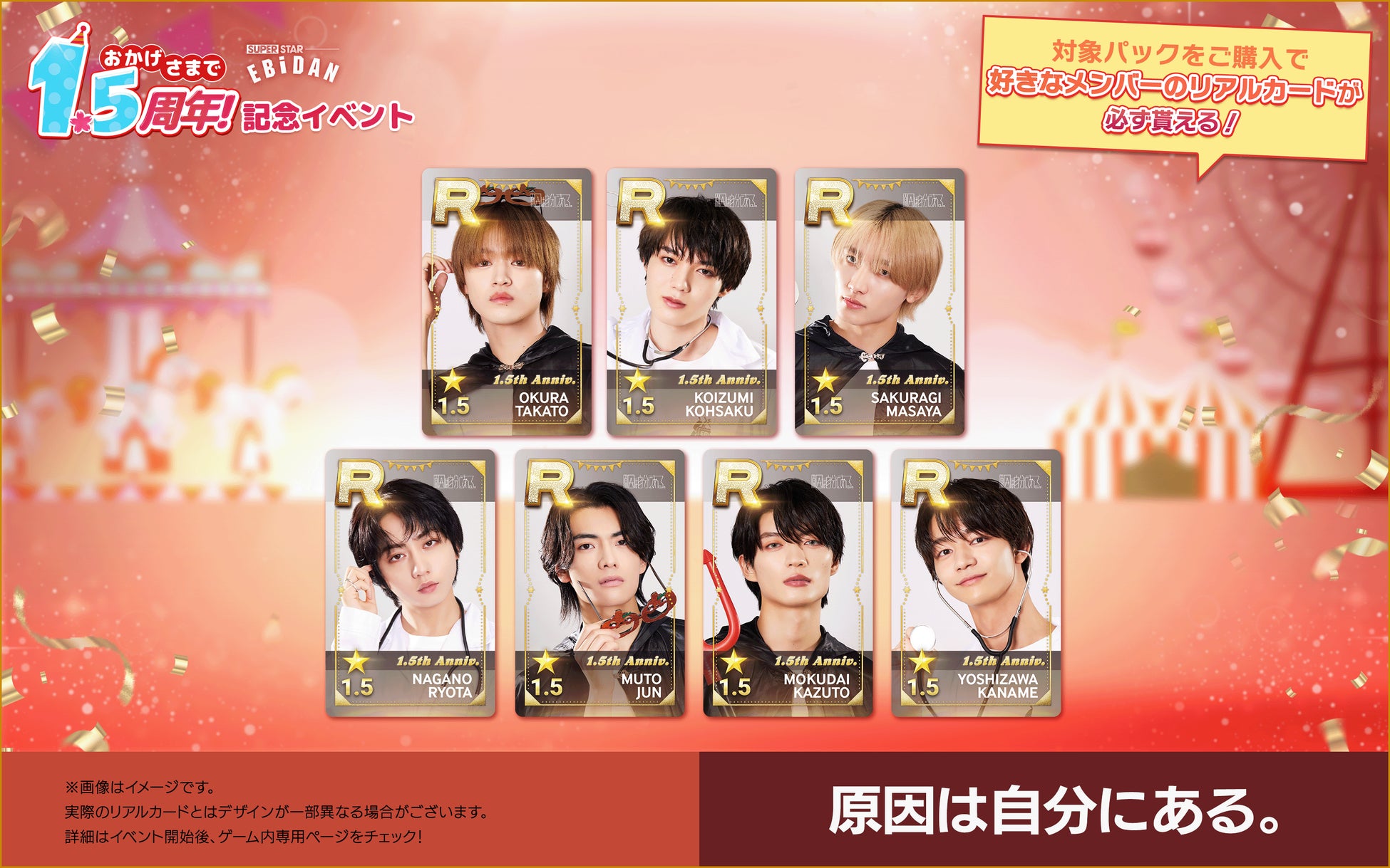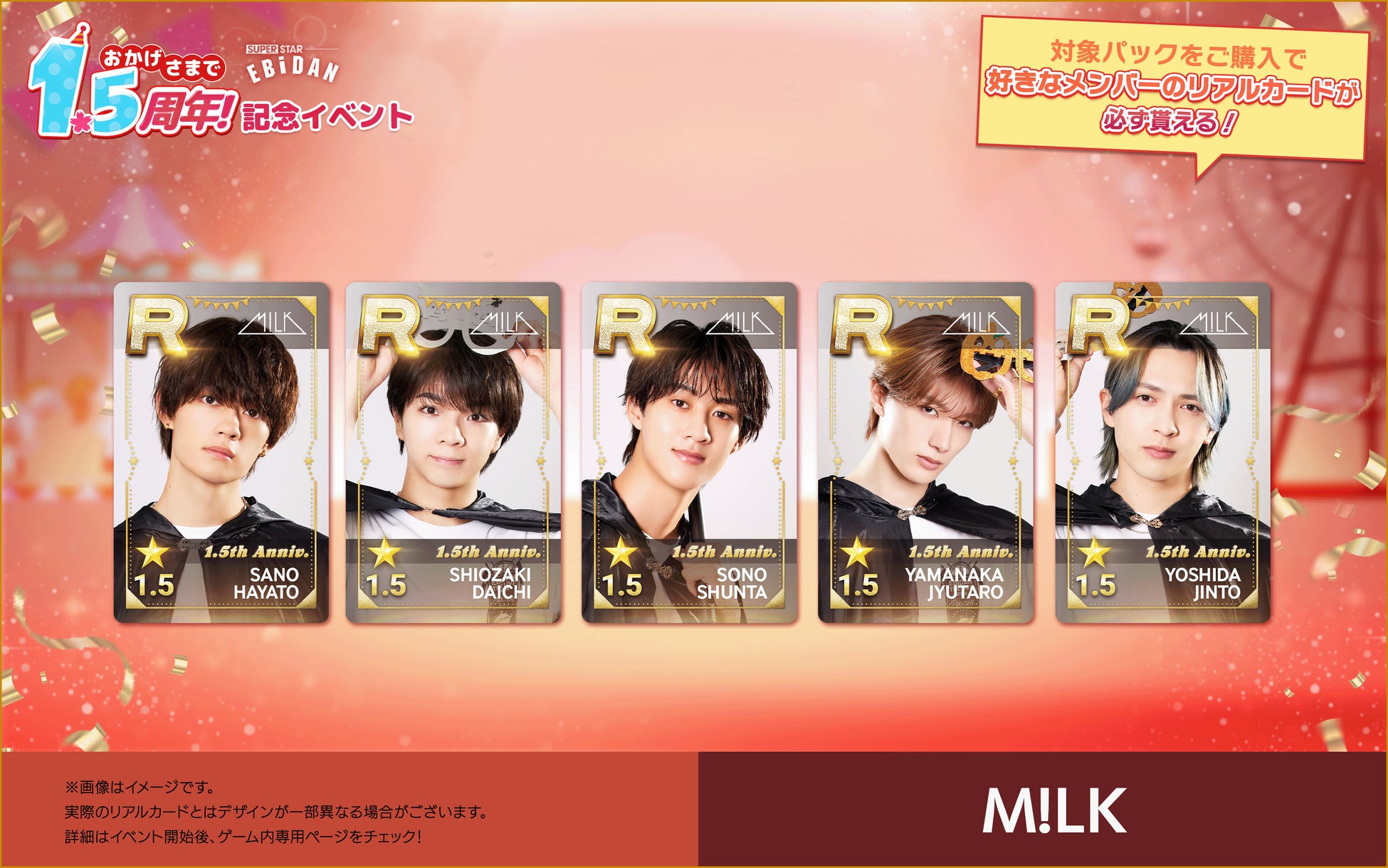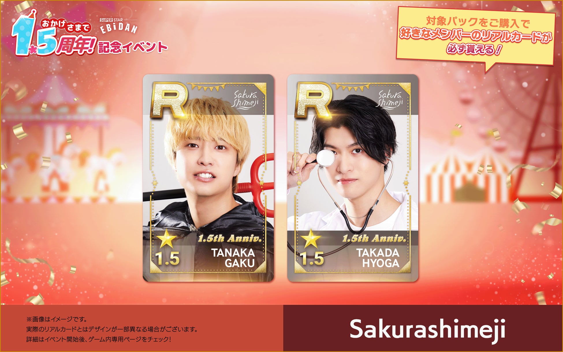 株式会社DalcomSoft Japanは、スターダストプロモーションに所属する超特急やM!LKなど、多数の人気ボーイズグループが所属する若手アーティスト集団・EBiDANの公式リズムゲームアプリ『SUPERSTAR EBiDAN』にて、本日(2025年4月24日)からサービス開始1.5周年を記念して推しのリアルカードが必ず交換できるパックの販売を開始したことをお知らせいたします。