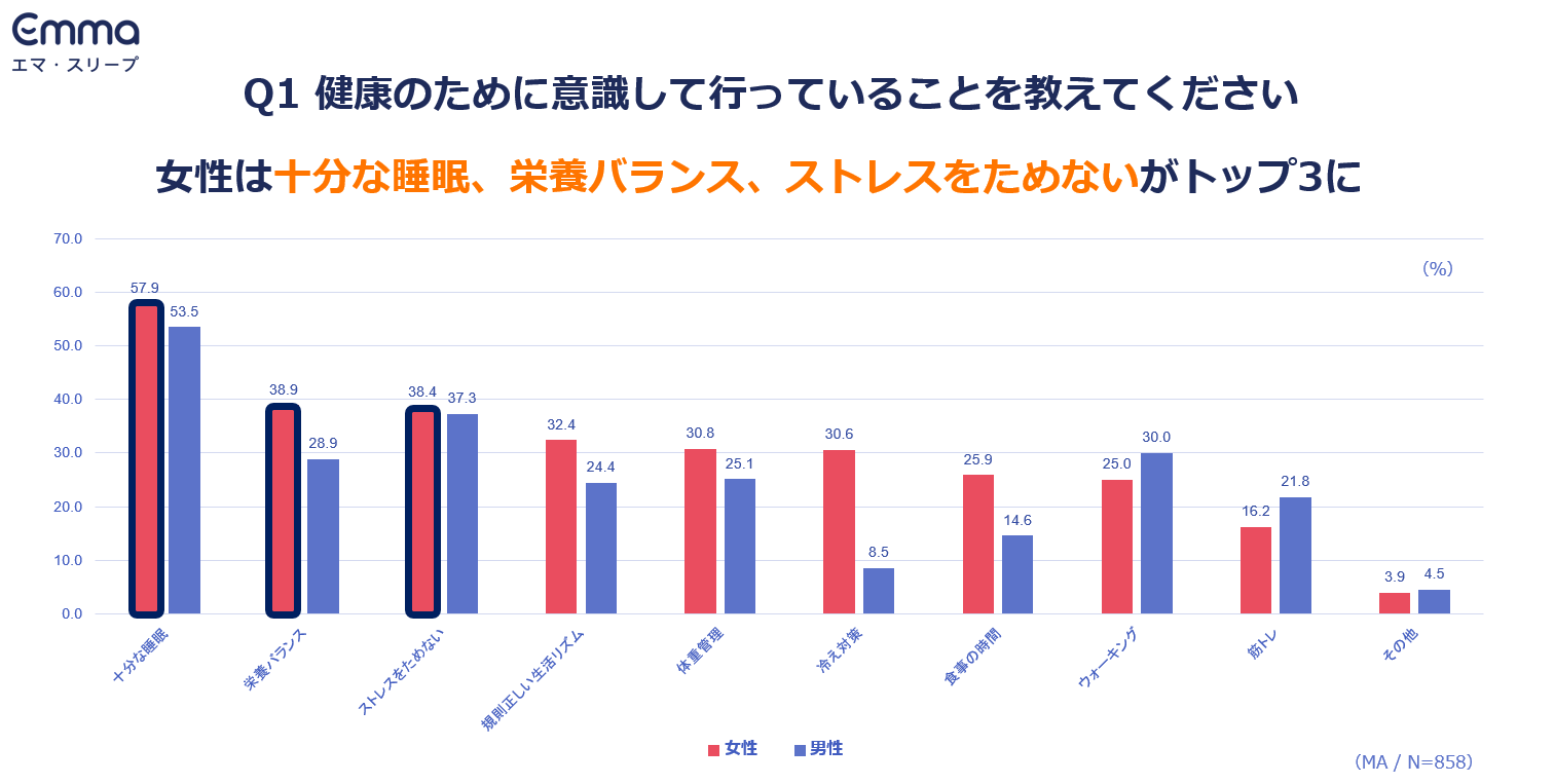 睡眠に関わる製品およびサービスを提供するスリープテック・ブランドEmma Sleep Japan合同会社(本社:東京都中央区、代表:マヌエル・ミュラー、以下エマ・スリープ)は、「働く女性の睡眠と健康に関する意識調査」を、全国の20~59歳の男女858人を対象にインターネットで実施しました。
