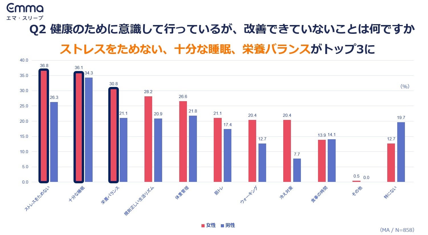 『健康のために意識して行っていること』への女性からの回答としては「十分な睡眠(57.9%)」「栄養バランス(38.9%)」「ストレスをためない(38.4%)」がトップ3になりました。また、『意識しているが改善できていないこと』への質問でも、同様にこの3つが上位に挙がり、意識していてもなかなか改善できていない実態が伺えます。