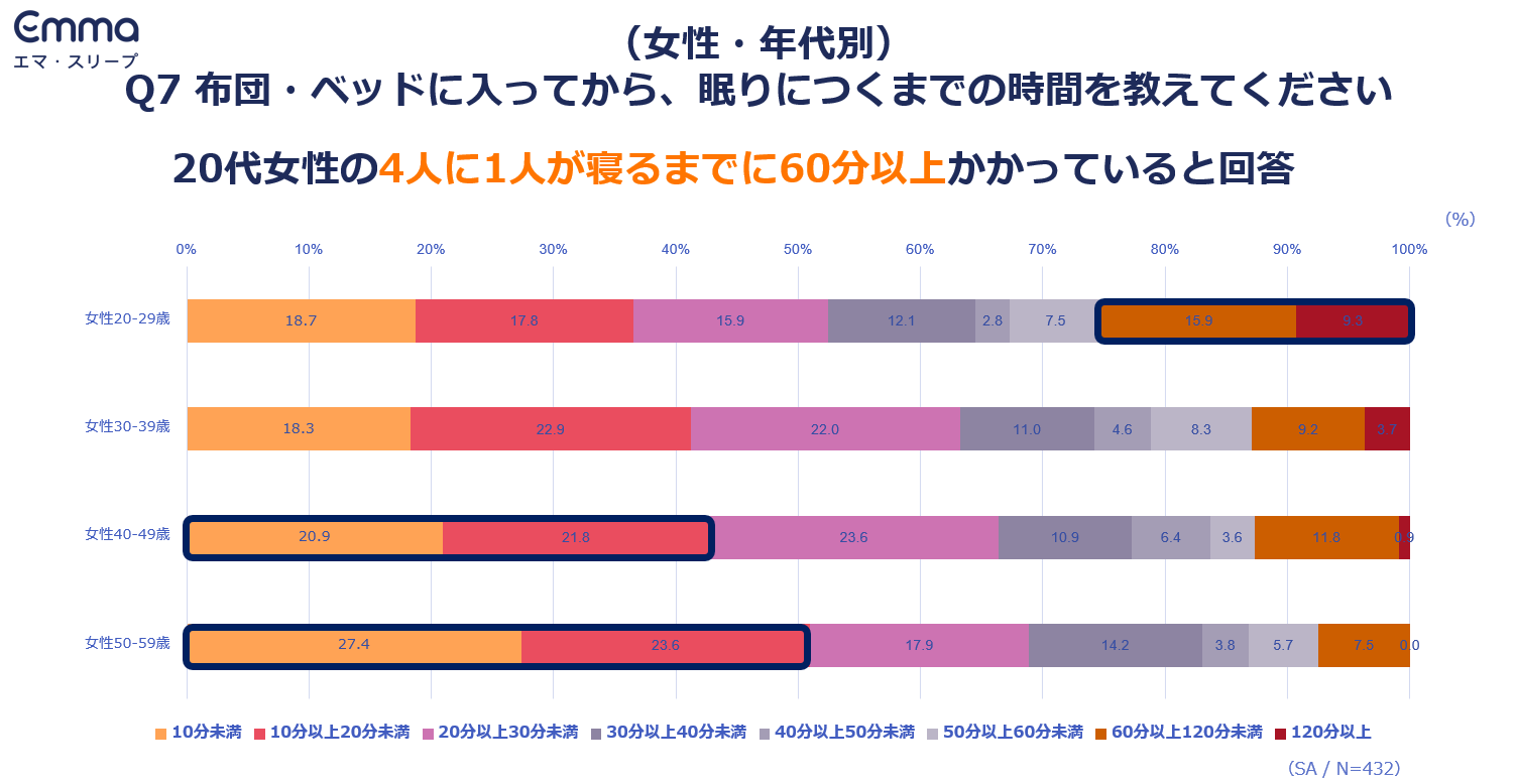 調査の結果から、20代女性の約4人に1人はベッド・布団に入ってから眠るまでに60分以上かかっていることが分かりました。また、女性が眠りにつけない理由としては、「プライベ―トの考えごと」「心配ごと」「仕事の考えごと」がトップ3になり、身体的な理由より、心理的な要因の方が眠りの妨げになっていることが調査結果から明らかになりました。