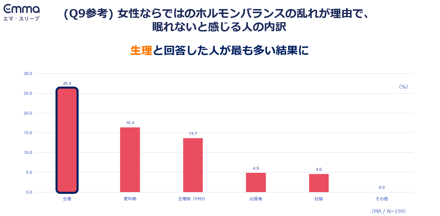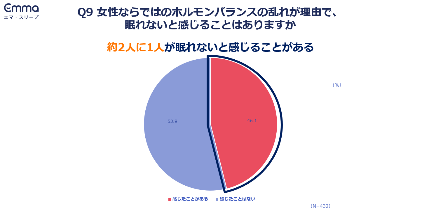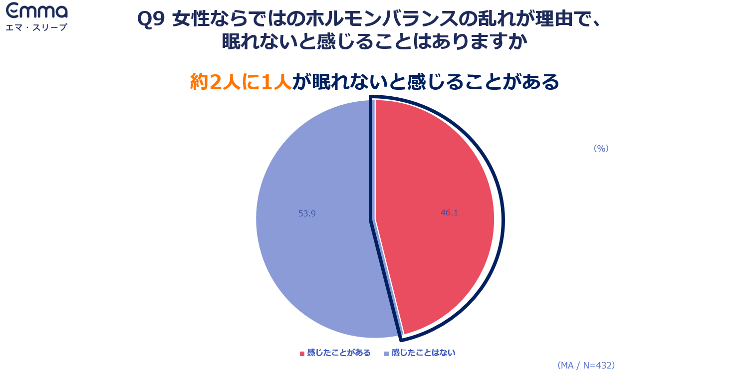 ■約2人に1人が女性ならではのホルモンバランスの乱れが原因で眠れないと感じたことがあると回答。その内訳としては「生理」が最も多い結果に。また、女性ならではのホルモンバランスの乱れからくる不調で改善したいことは「イライラ」「だるさ」「感情の起伏」がトップ3に。