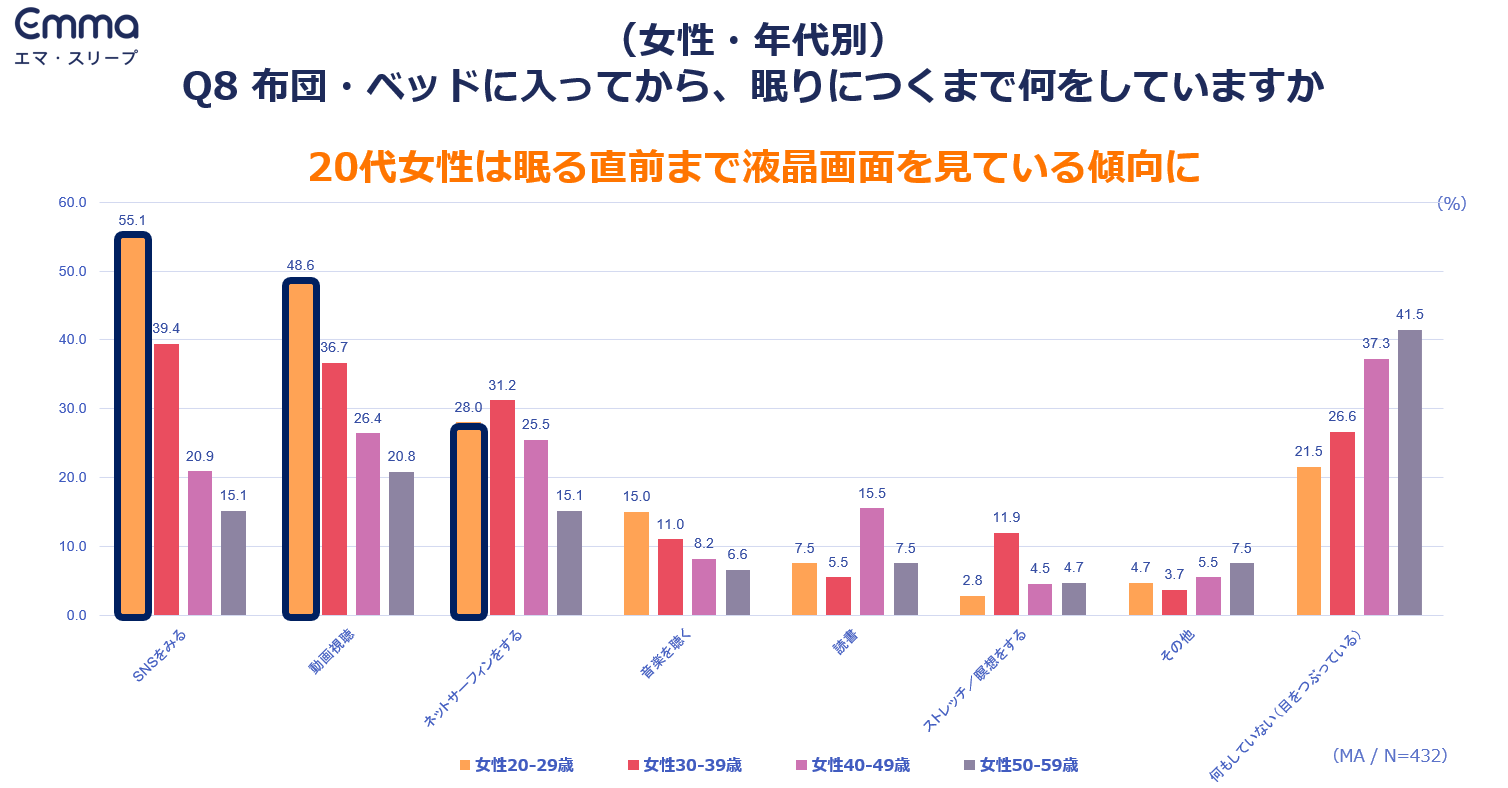 『布団・ベッドに入ってから、眠りにつくまでの時間』では、40代~50代女性の約半数が20分未満に眠りについている一方で、20代女性の約4人に1人は眠るまでに60分以上かかっていることがわかりました。『布団・ベッドに入ってから、眠りにつくまで何をしていますか』の問いに対して20代女性は、「SNSをみる(55.1%)」「動画視聴(48.6%)」「ネットサーフィンをする(28.0%)」と回答した人が多く、眠る直前まで布団・ベッドの上で長時間に渡って液晶画面を見ている傾向にあることが判明しました。