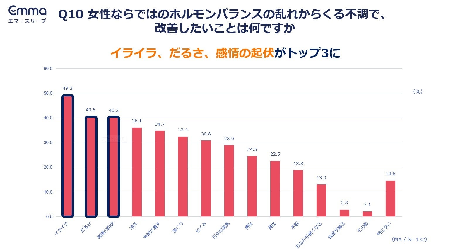 『女性ならではのホルモンバランスの乱れが理由で眠れないと感じることがあるか』では、46.1%が「眠れないと感じることがある」と回答。つまり、約2人に1人の女性が、ホルモンバランスが理由で眠れない経験をしたことがあるという結果となりました。眠れない理由の内訳としては、「生理(26.4%)」「更年期(16.4%)」「生理前(PMS)(13.7%)」が挙がりました。この結果から、ホルモンバランスの乱れが睡眠にも影響を与えていることが見て取れます。また、『ホルモンバランスの乱れからくる不調で改善したいこと』としては「イライラ(49.3%)」「だるさ(40.5%)」「感情の起伏(40.3%)」がトップ3に。気分や体調など、様々な悩みごとを解決したいと感じていることが伺える結果となりました。