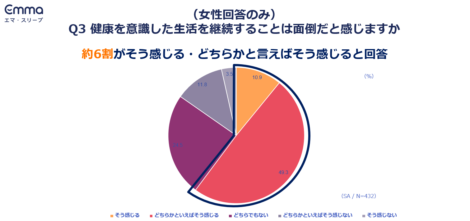 また、『健康を意識した生活を継続することは面倒だと感じますか』という質問に対しては、約6割の女性がそう感じる・どちらかといえばそう感じると回答し、意識したい気持ちがあるものの、面倒に感じている人も多いようです。
