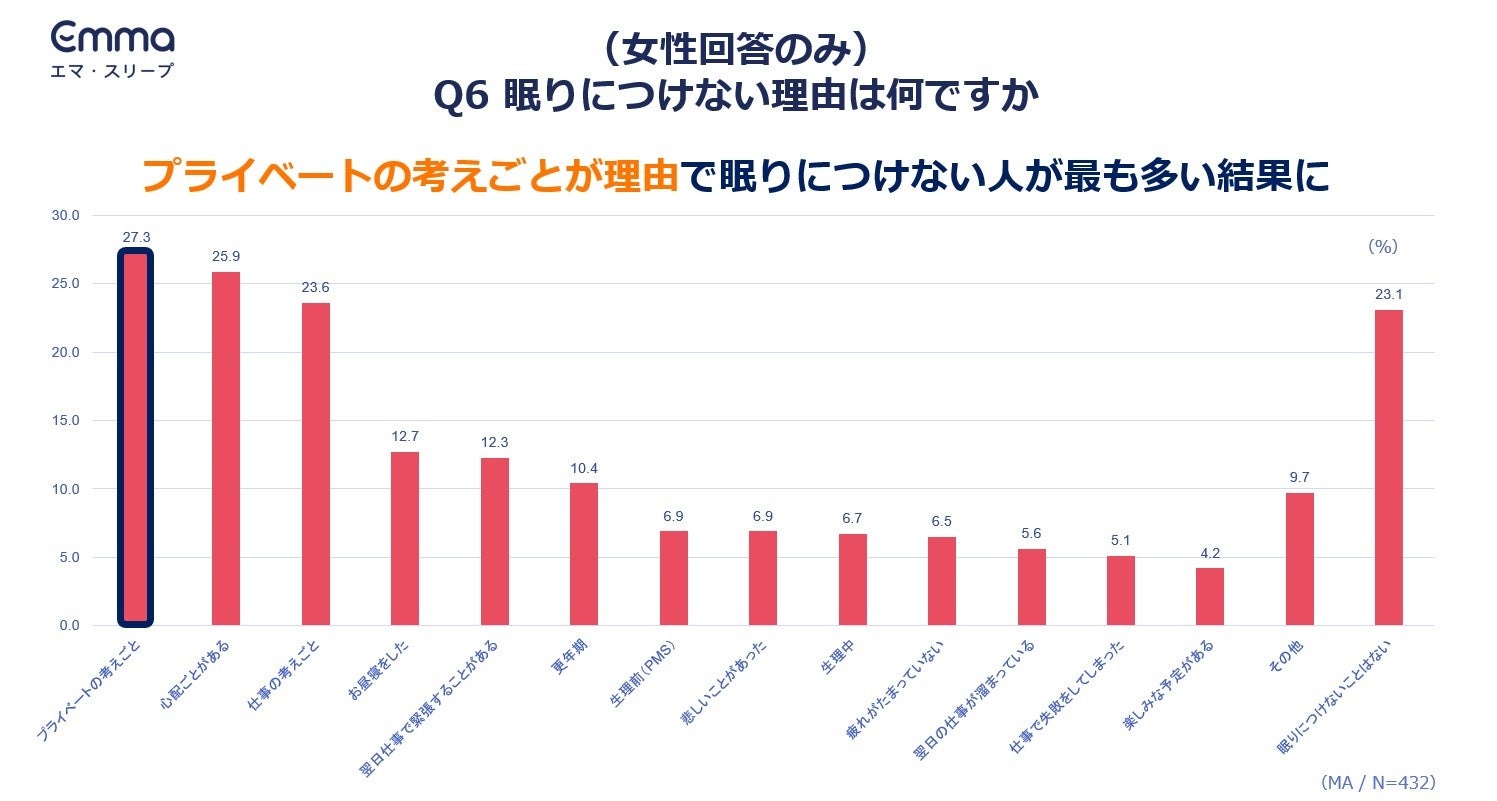 一方で、『睡眠不足を感じることがありますか』への回答には、女性の50.5%が「常に感じる」「良く感じる」と回答。意識をしているにも関わらず、質の良い睡眠をとれていない人が多くいることが推察されます。また、『眠りにつけない理由』としては「プライベートの考えごと(27.3%)」「心配ごと(25.9%)」「仕事の考えごと(23.6 %)」がトップ3になり、仕事、プライベート問わず、心理的な要因が、睡眠の妨げになっていることがわかりました。