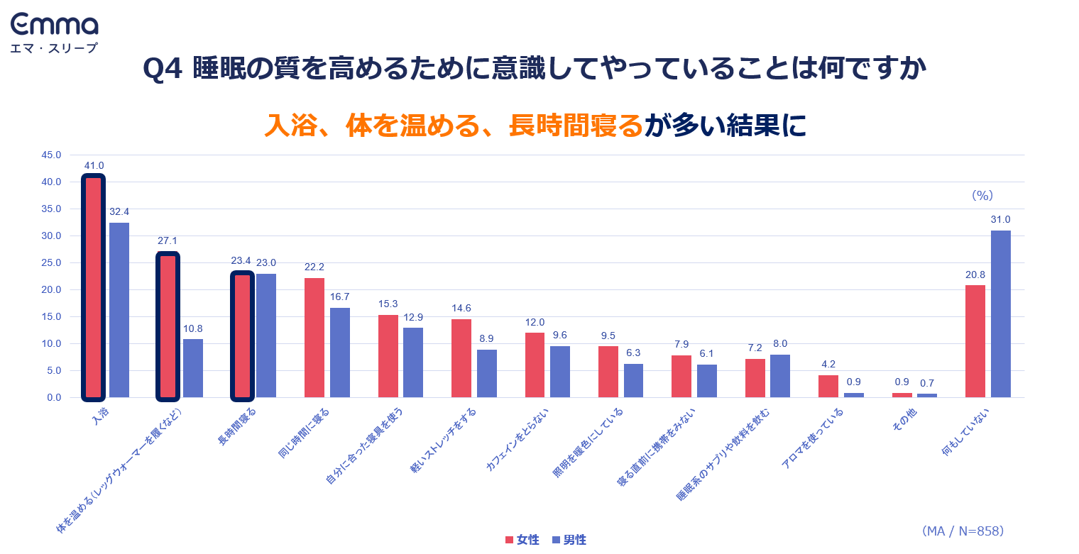『睡眠の質を高めるために意識してやっていること』についての回答では、女性の41.0%が「入浴」と回答し、「体を温める(27.1%)」「長時間寝る(23.4%)」と続きました。また、「何もしていない」と回答した人が20.8%と、5人に4人は睡眠の質を高めるために、何かしら意識をして行っている実態が明らかになりました。