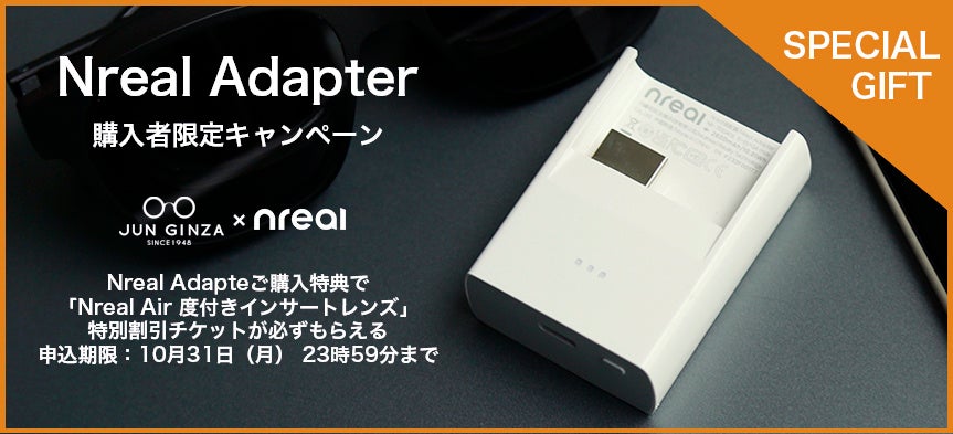 「Nreal Air」が様々なスマート機器に対応可能となる「Nreal Adapter」を、日本国内でご購入された方、かつ、Nrealにお申込みいただいた方に、もれなくJUN GINZAのNreal Air 度付きインサートレンズ30%オフチケット*を贈呈するキャンペーンを開催します。Nreal Adapterはどの店舗でご購入されても本キャンペーンに参加することが可能です。