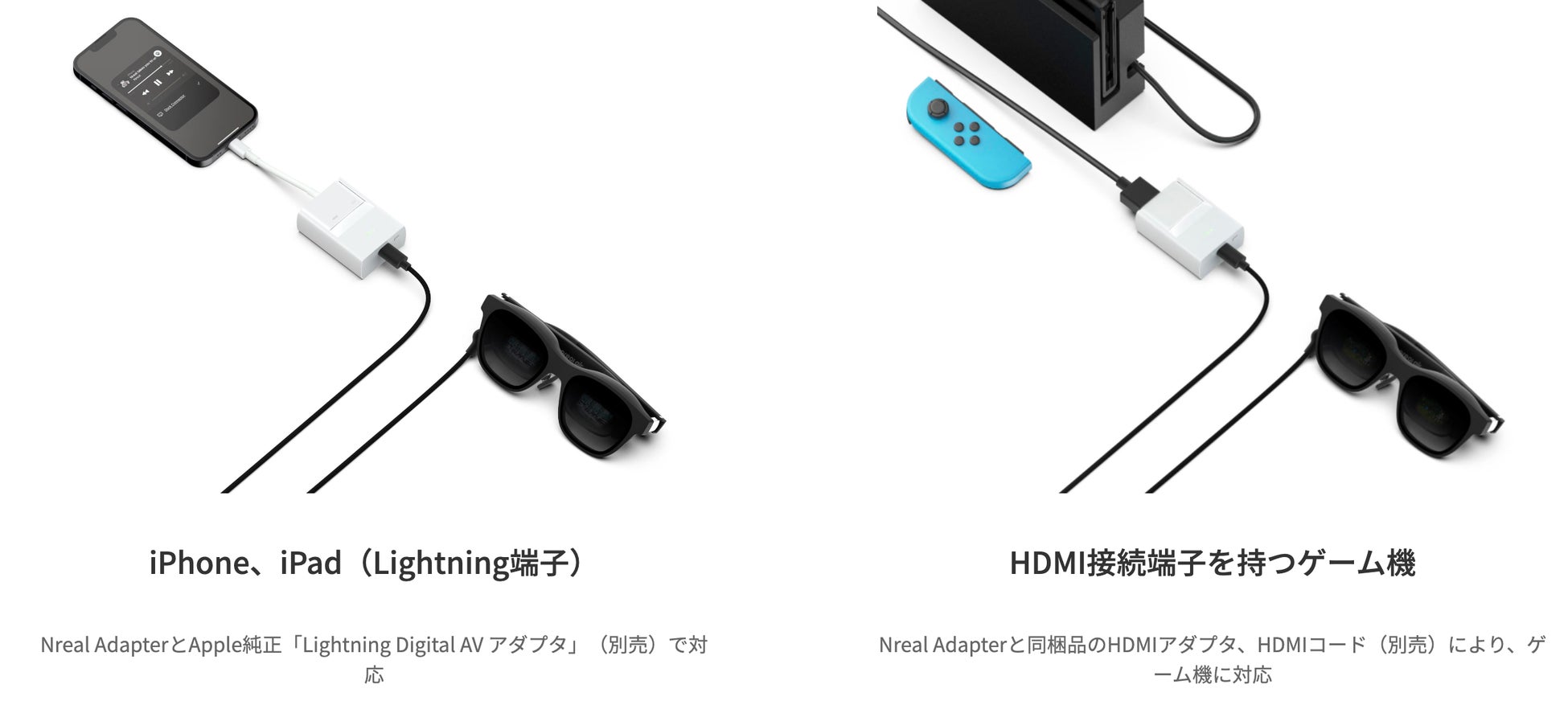 ※Nreal Adapterと同梱品のHDMIアダプタ、市販のHDMIコード(別売)により、HDMI入力を備えた一部のゲーム機に対応。現在Nintendo Switchのみテスト済み。