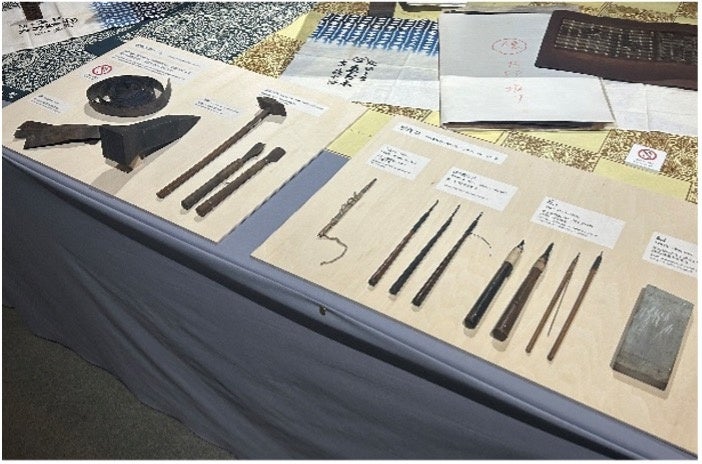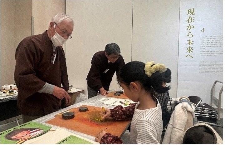 「職人の技術」ゾーンでは、伝統的な型彫りとデジタルトレースの技術を間近で大画面を通してご覧いただく実演展示や京都染型協同組合の技術をつくした作品展示、職人による子供たちのための型染体験の展示を行いました。