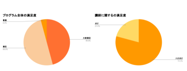 今回の内定者グランプリ全体の満足度は95.8%が満足という好評な結果になりました。またグランプリ内での講師の満足度も高く講義からグループワークまで全体的に参加していただいた参加者に価値を提供することができました。