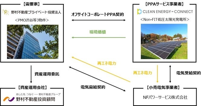 顧問」)が運用を受託する野村不動産プライベート投資法人(以下「NPR」)は、保有するオフィス「PMO渋谷」等3物件において、株式会社クリーンエナジーコネクト(本社:東京都千代田区/代表取締役:内田鉄平、以下「クリーンエナジーコネクト」)と、Non-FIT低圧太陽光発電所(以下「本発電所」)から追加性のある再生可能エネルギーを長期で調達するオフサイトコーポレートPPAサービス契約(以下「本契約」)を締結し、2023年11月より運用を開始いたしましたので、お知らせいたします。