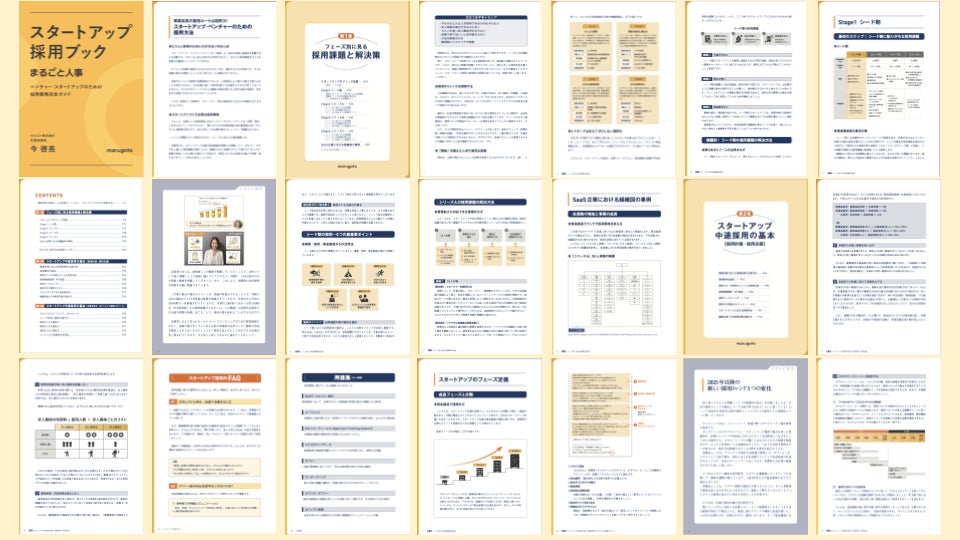 本ブックは書籍『「本当にほしい人材」が集まる中途採用の定石』の著者である今 啓亮が、「まるごと人事」で培ってきた500社以上の採用実績をもとにスタートアップやベンチャー企業におけるフェーズごとの採用ノウハウをまとめたものです。合計165ページ・全9万字・図解55点で構成されており、どなたでも無料でダウンロードいただけます。
