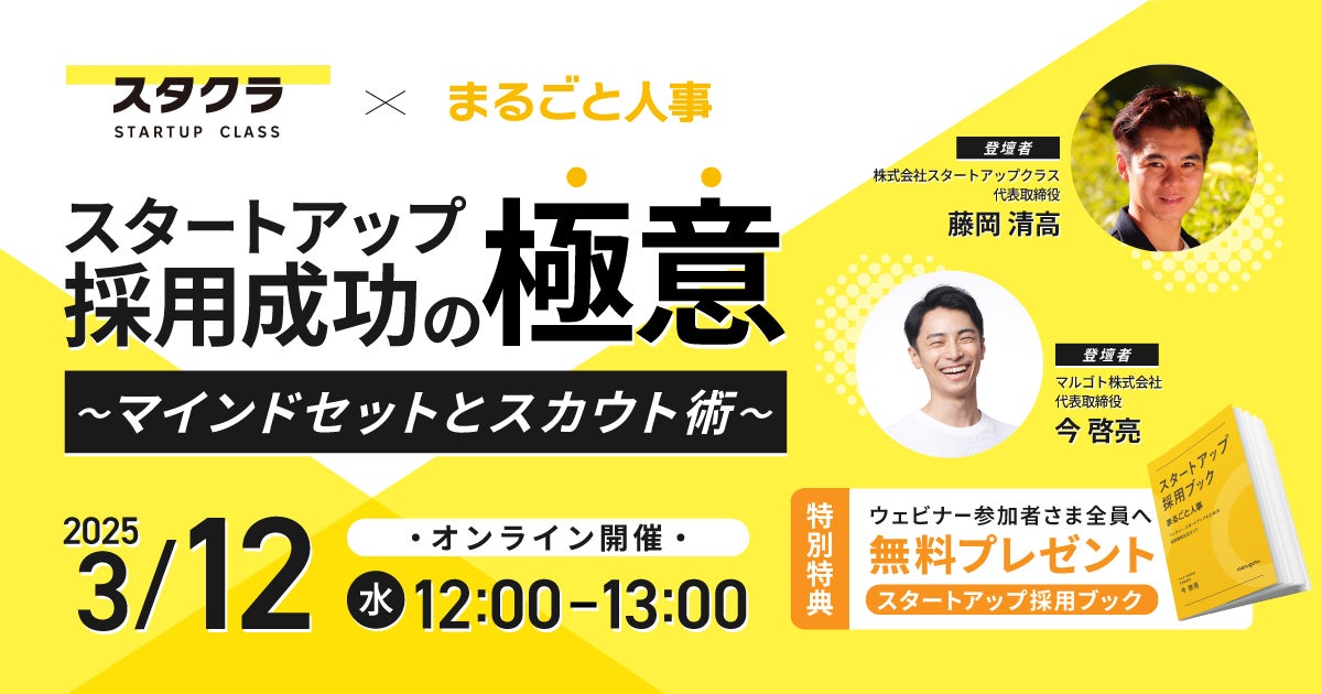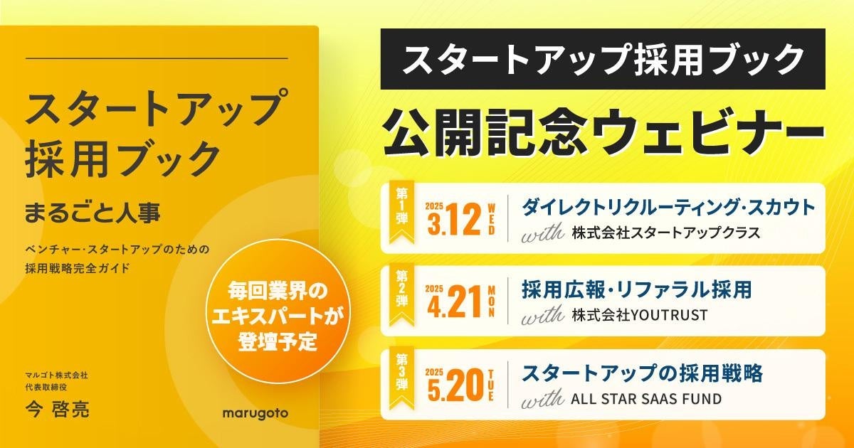 月額制の採用代行サービス「まるごと人事」「まるごと人事ライト」などを展開するマルゴト株式会社(北海道札幌市・代表取締役 今 啓亮、以下マルゴト)は、スタートアップ企業の採用手法やノウハウを無料でDLできる『スタートアップ採用ブック』の公開を記念して、全3回の無料ウェビナーを開催いたします。