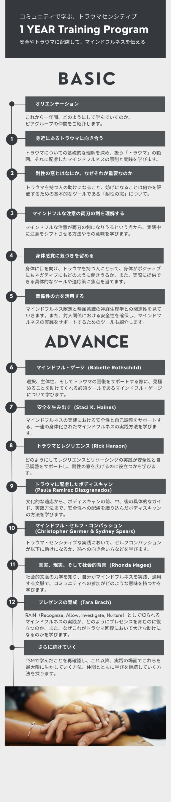 ※TSMは、トラウマ治療を目的としたものではなく、トラウマ・インフォームド・ケアの観点から、安全性・多様性といった側面からマインドフルネスを伝える上で配慮しておくべきことを学ぶものです。