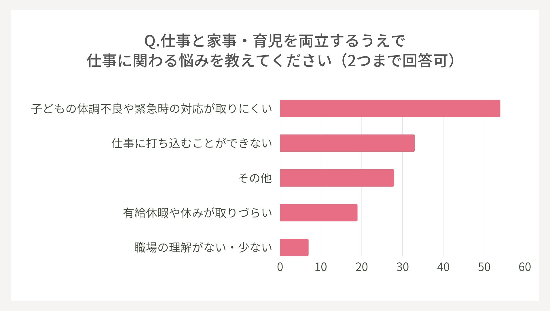 仕事関係の悩みでもっとも多かった回答は「子どもの体調不良や緊急時の対応が取りにくい」で、全体の半数以上の54件寄せられました。