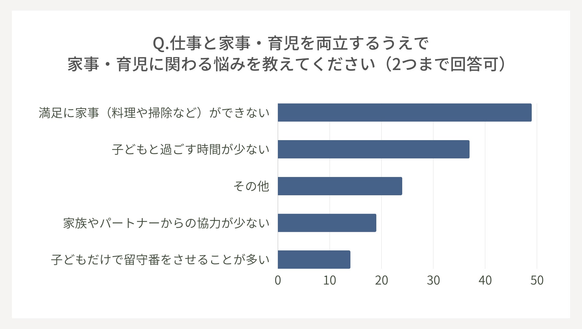 次に多かった回答は「子どもと過ごす時間が少ない」で、回答数は37件でした。日々の中でも特に平日は、仕事と家事で時間が過ぎていく中で、子どもとゆっくり向き合うひとときを持ちにくい方は多いようです。