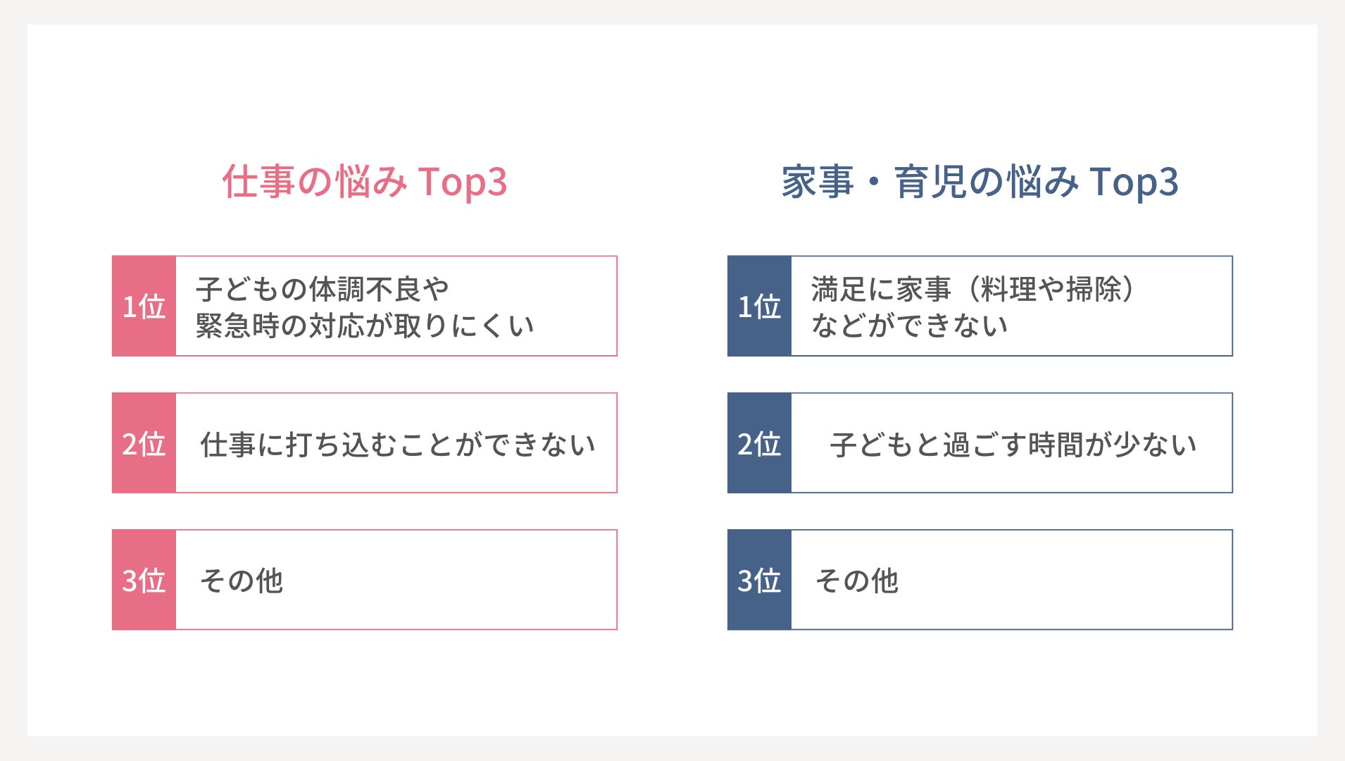 そこでアンケートでは「仕事に関わる悩み」と「家庭に関わる悩み」をそれぞれ伺いました。