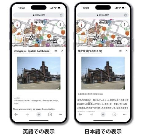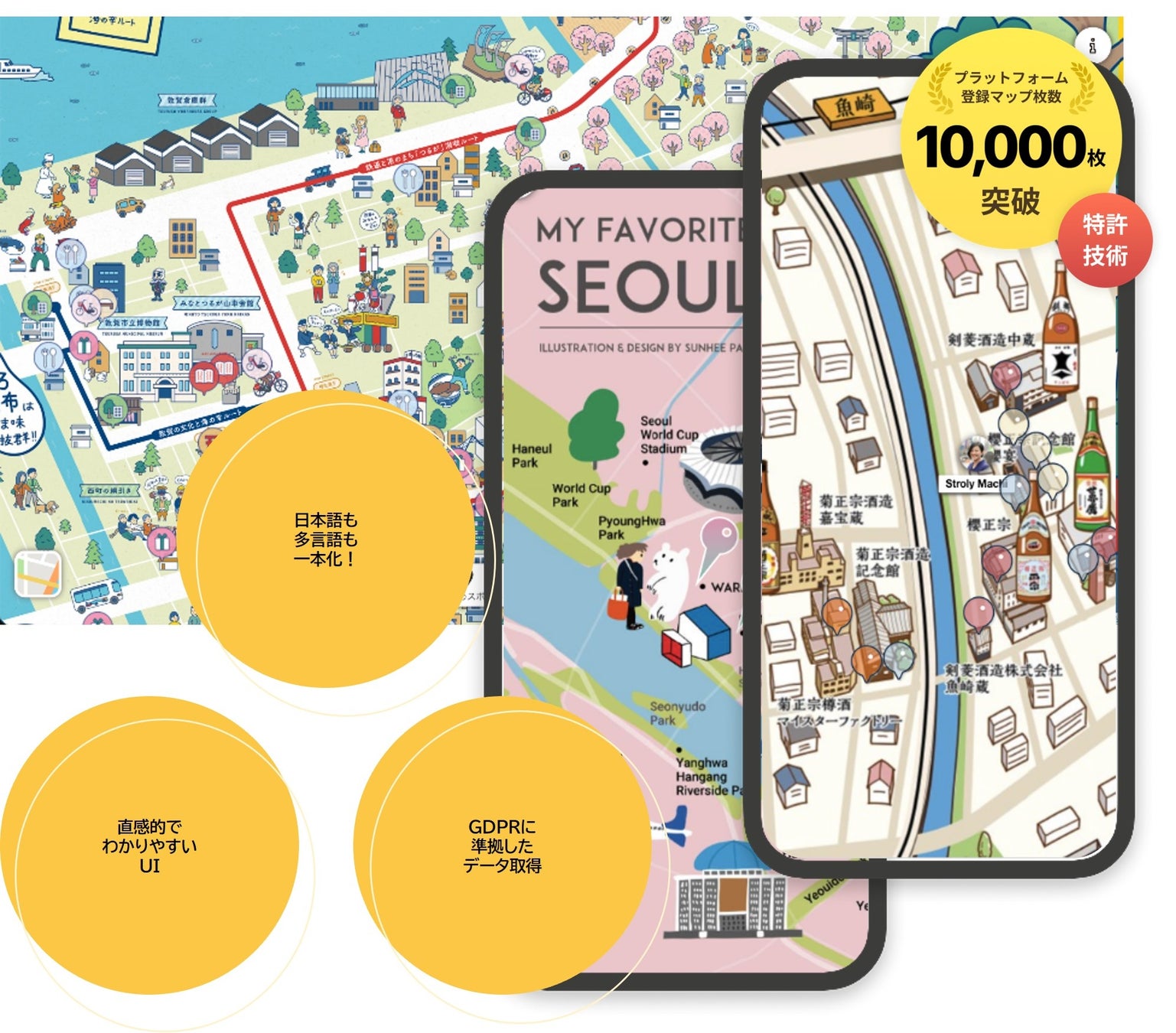 Strolyが運営するイラストデジタルマップ『Stroly』は、世界観を感じられるわかりやすいイラストを通じて、そのエリアのワクワクする情報に「出会って・知って・体験する」までを徹底的にガイドするマッププラットフォームです。日本各地の観光・祭りやイベント・エリアプロモーションをはじめ、世界11,000枚のイラストデジタルマップが存在します。おすすめのポイントやイベント情報を提供し、シールを貼るような感覚でイラストを配置するなど、マップをカスタマイズすることも可能です。さらに、マップの閲覧情報を元に、人流データや利用情報の可視化や、インバウンド対策としての多言語化対応にもなっています。