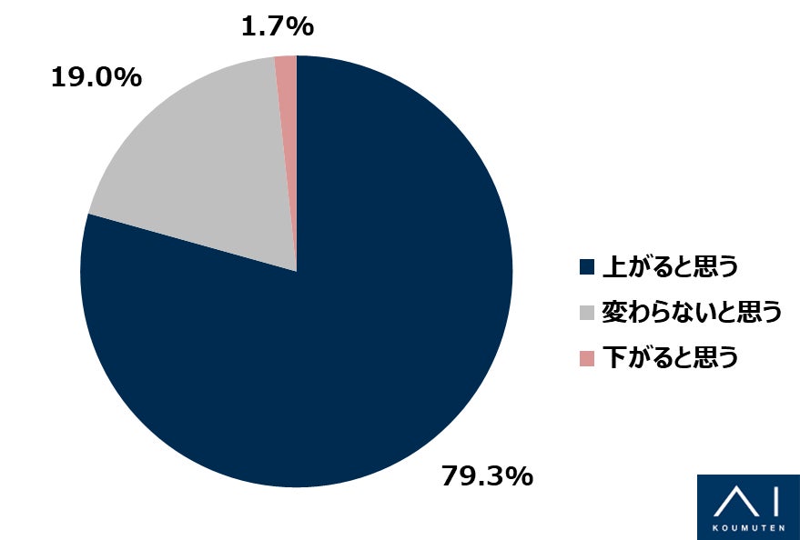 さらに、今後住宅購入の原価(木材・設備・工事費用など)がどうなると考えているかお聞きしたところ、「上がると思う」と回答した方が約8割という結果となり、「下がると思う」と回答した方はわずか1.7%にとどまりました。