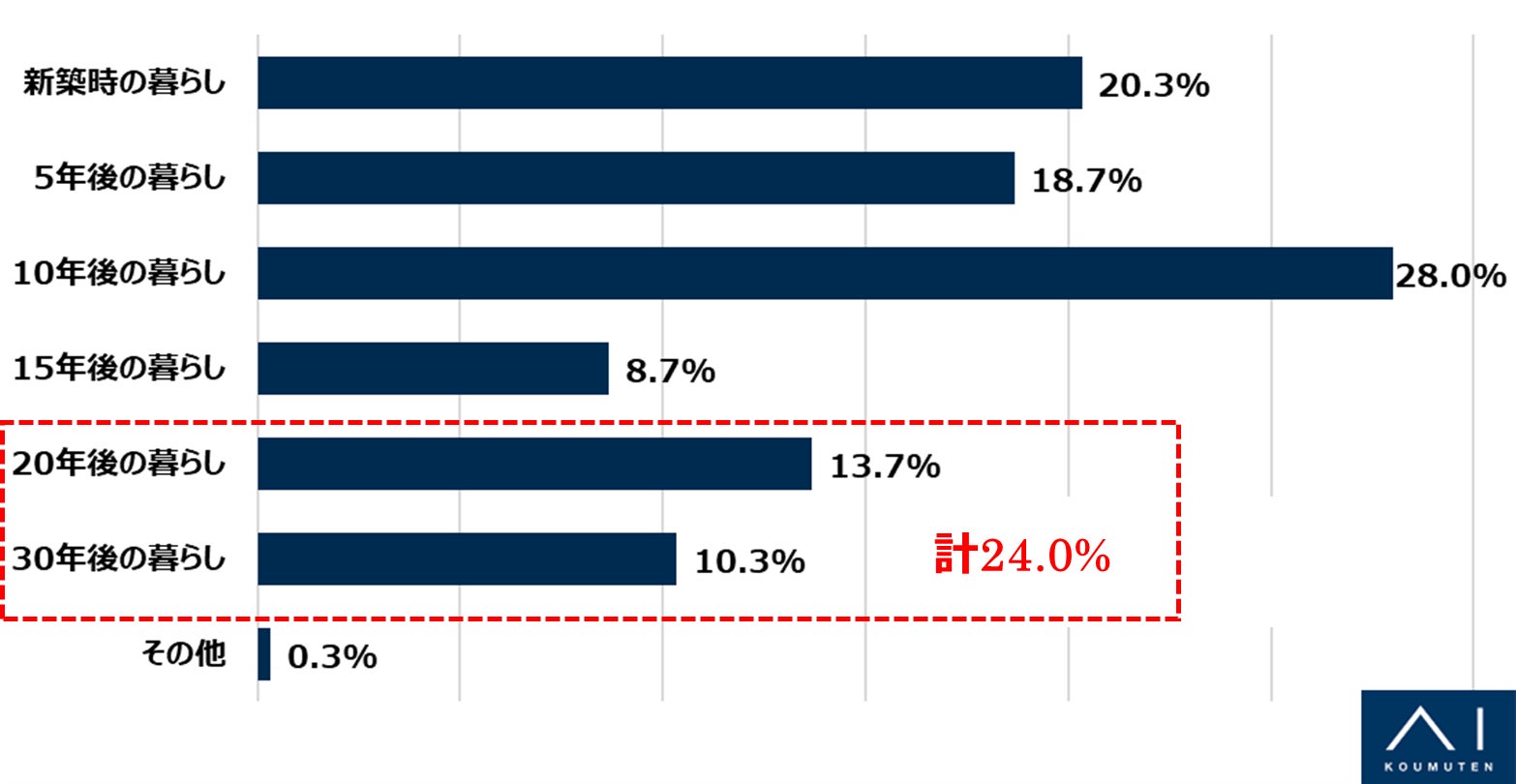 いつの暮らしを見据えてマイホームの購入を検討しているかお聞きしたところ、「10年後の暮らし」と回答した方が最も多く28.0%、次いで「新築時の暮らし」で20.3%という結果でした。また、20年以上後の暮らしと回答した方も計24.0%(「20年後の暮らし」13.7%、「30年後の暮らし」10.3%)と判明。