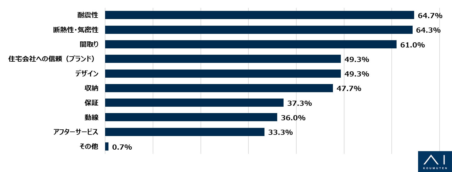 直近3年以内に注文住宅の購入を検討している方に聞いた「マイホームに関する調査」 絶対に譲れないポイント1位「耐震性」2位「断熱性・気密性」3位「間取り」