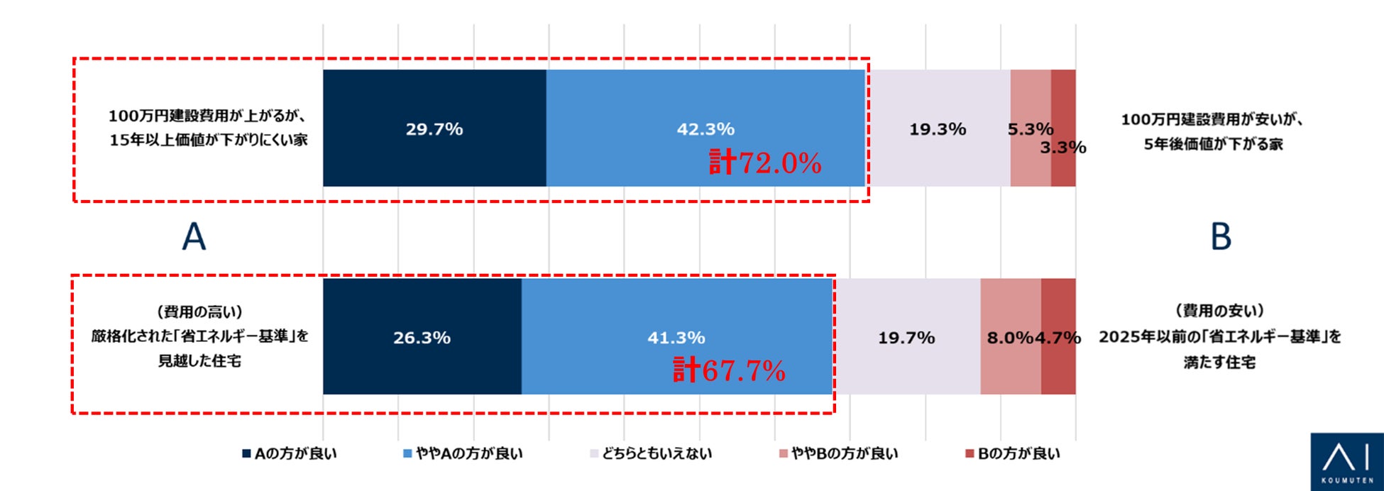 また、住宅の「省エネルギー基準」に対する考え方としては、「(費用の高い)2025年に厳格化される『省エネルギー基準』を見越した住宅」と「(費用の安い)2025年以前の『省エネルギー基準』を満たす住宅」のどちらが良いかをお聞きしたところ、67.7%の方が「(費用の高い)2025年に厳格化される『省エネルギー基準』を見越した住宅」を望んでいる結果となりました。