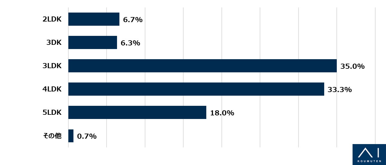 直近3年以内に注文住宅の購入を検討している方にマイホームの理想の間取りをお聞きしたところ、「3LDK」が35.0%と最も多く、次いで「4LDK」が33.3%、「5LDK」が18.0%という結果でした。