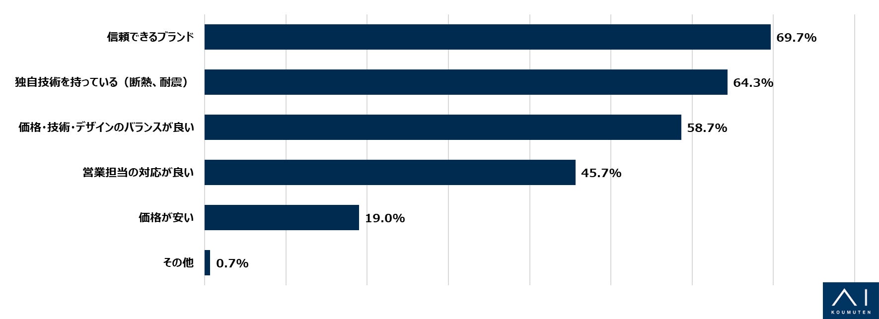 住宅メーカーを選定する際のポイントをお聞きしたところ、「信頼できるブランド」であることが最も高く69.7%、次いで「独自技術を持っている(断熱、耐震)」が64.3%、「価格・技術・デザインのバランスが良い」が58.7%という結果となりました。住宅メーカーの信頼性はもちろん、独自技術や価格とのバランスなども吟味して選定しているようです。