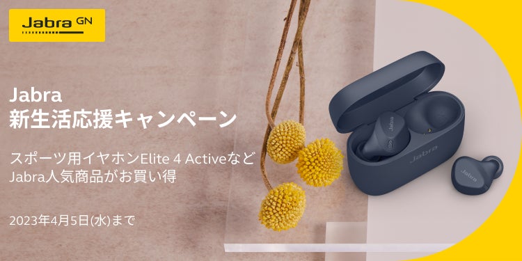 抜群の通話性能を備え、普段使いはもちろんビジネス用としても最適な完全ワイヤレスイヤホン「Jabra Elite 7 Pro」や、スポーツ用イヤホンとして人気の「Jabra Elite 4 Active」などの「Elite」シリーズをはじめ、ハイブリッドワークにお勧めの「Connect 4h」などの人気製品を最大33%オフの価格にて、全国の主要家電量販店、eコマース、Jabra オンラインストアで販売します。新しい生活の始まりに合わせて、ビジネスから普段使いまで快適に使えるJabra製品を、ぜひこのお得な機会にお買い求めください。