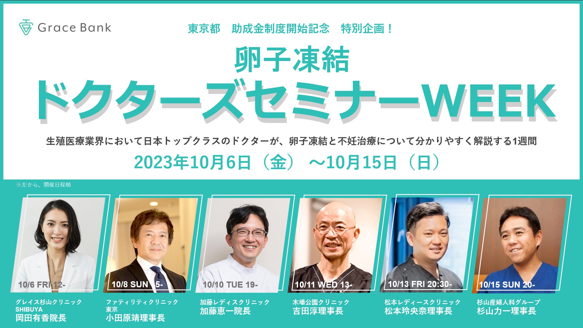 「Grace Bank」では、2023年10月6日〜10月15日に、提携クリニックのドクターが登壇する「卵子凍結ドクターズセミナーWEEK」を開催いたします。生殖医療業界における著名ドクターが卵子凍結と不妊治療を分かりやすく解説するセミナーを連続開催することにより、卵子凍結を検討する方が必要な情報を収集し、採卵を実施するクリニックを比較して選ぶ機会を提供することで、卵子凍結の選択を支援いたします。