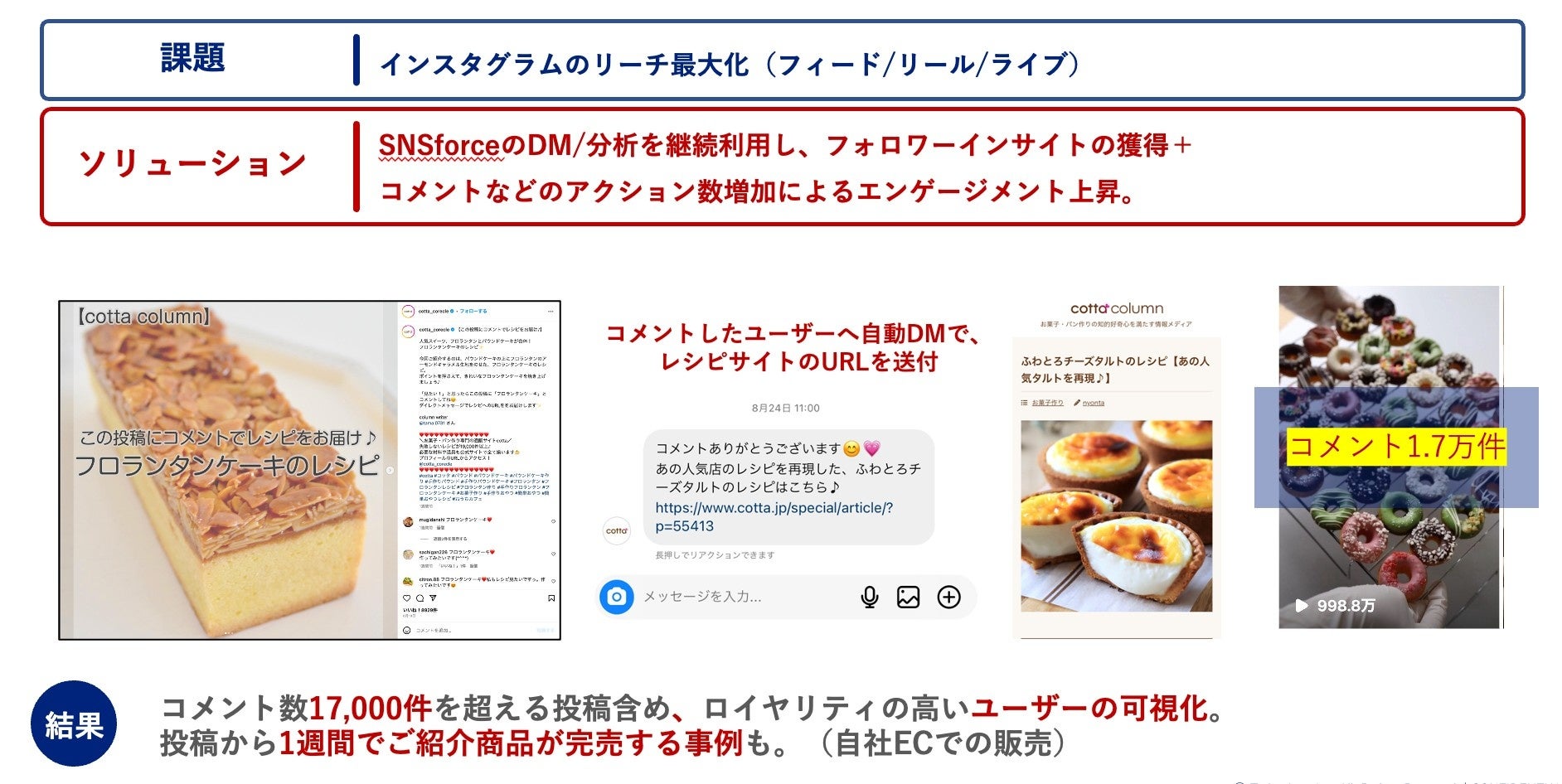 cotta様では、SNS forceを1年以上継続して活用いただいており、それによりフォロワーに対して「コメントをするとレシピがもらえる」という認識を確立することができたという、顧客ナーチャリングも実現できています。