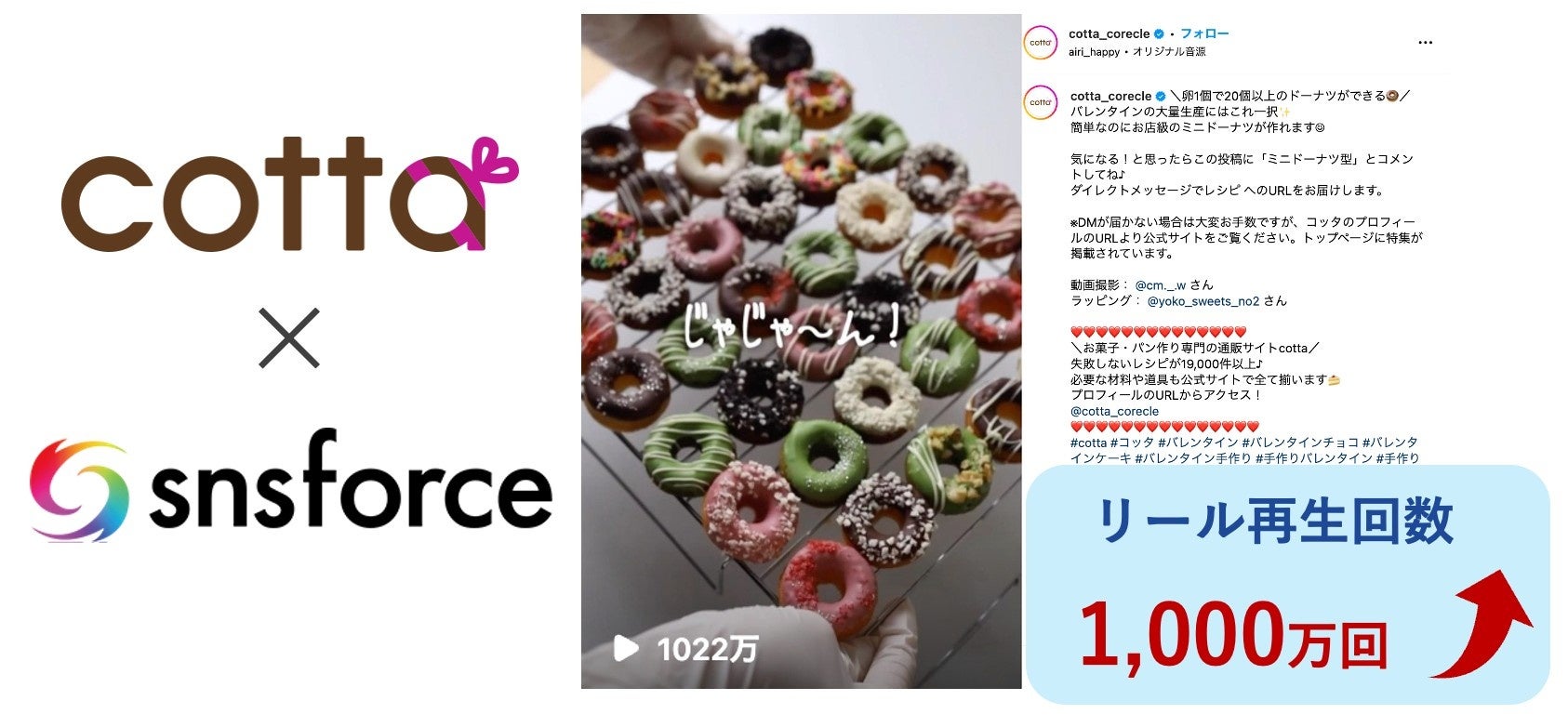 株式会社テイラーアップ(所在地:東京都渋谷区、代表取締役社長:松村 夏海)は、製菓・製パン材料のECサイト「cotta」様のInstagram運用において、Instagram/X(旧 Twitter)の分析・コマースシステム「SNS force」を導入いただきました。これにより、リール投稿動画の再生回数が1000万回を超えました。