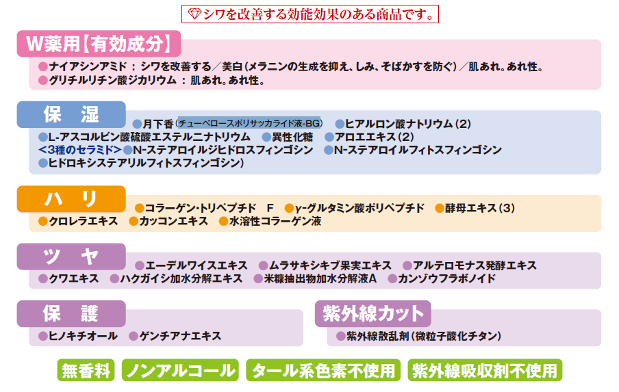 有効成分ナイアシンアミドとグリチルリチン酸ジカリウムのW薬用で、シワ改善、美白※2、肌あれを防止。