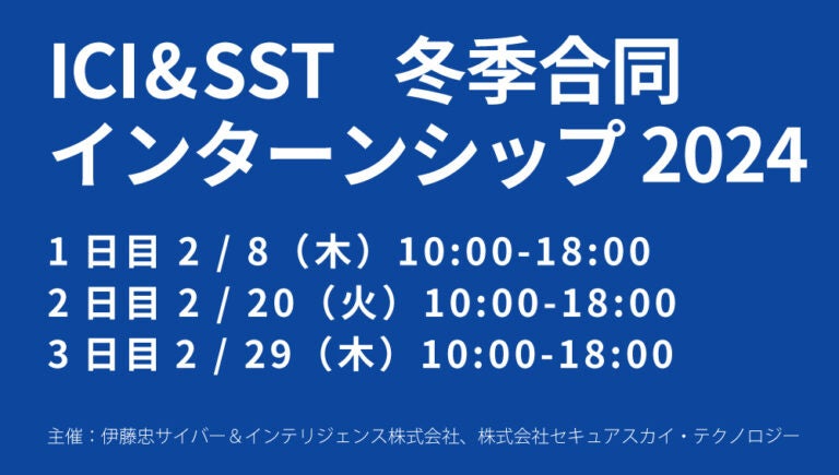 伊藤忠サイバー&インテリジェンス株式会社(本社:東京都港区 代表取締役:浦上 善一郎 以下、ICI)と株式会社セキュアスカイ・テクノロジー(本社:東京都千代田区 代表取締役:大木 元 以下、SST)は、学生向けにセキュリティを学び&体験する冬季合同インターンシップを2024年2月8日から3週間に渡り、開催いたします。