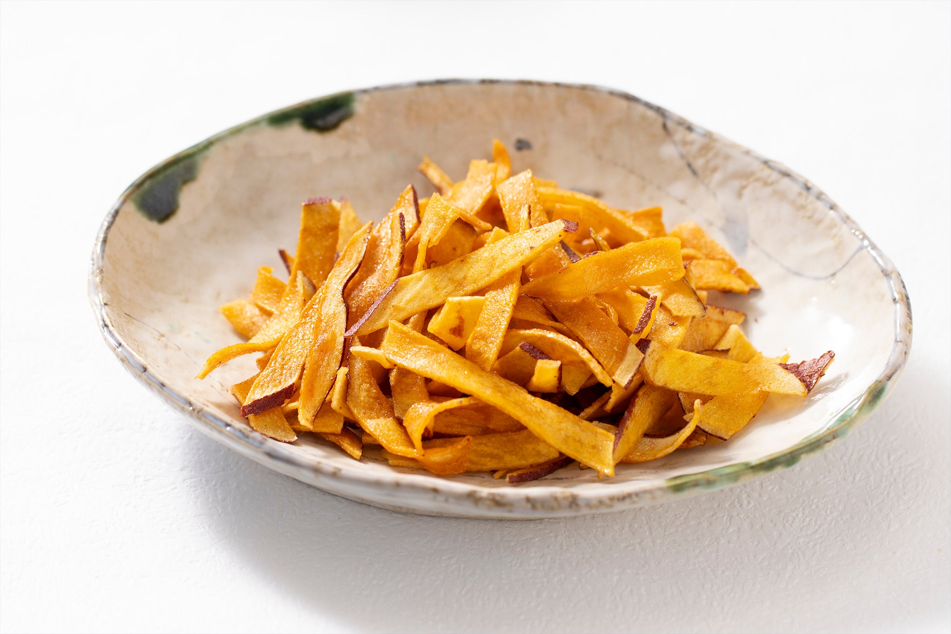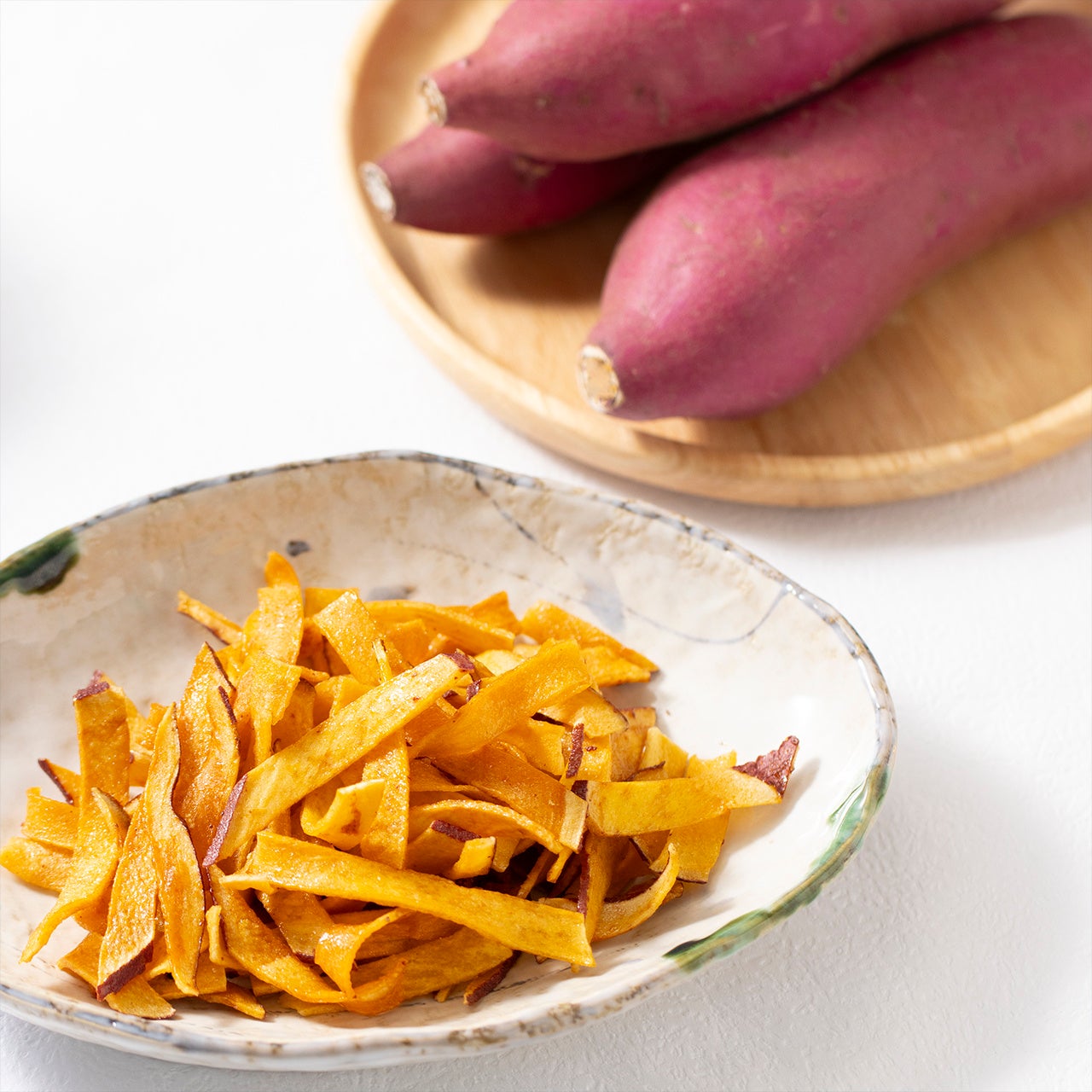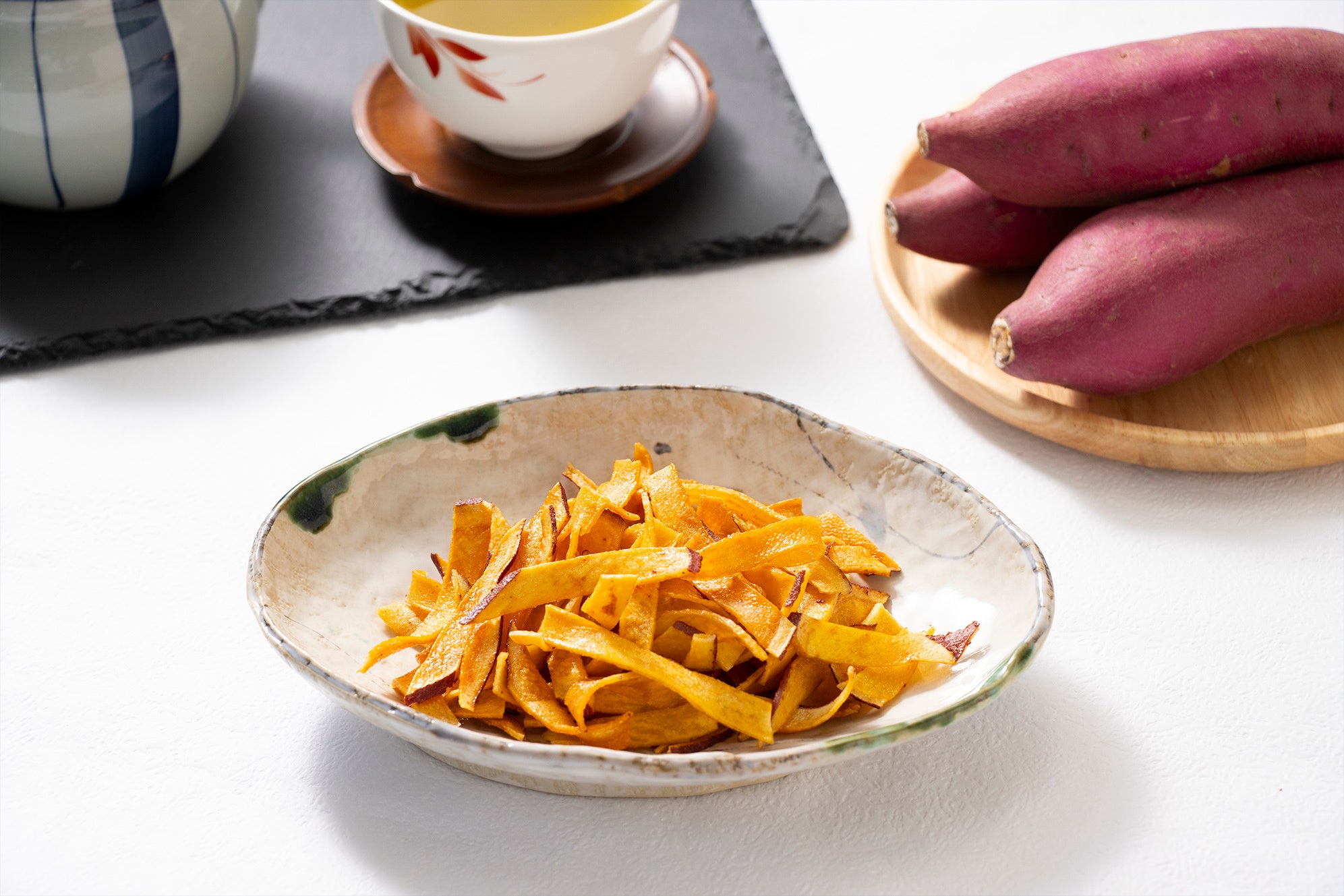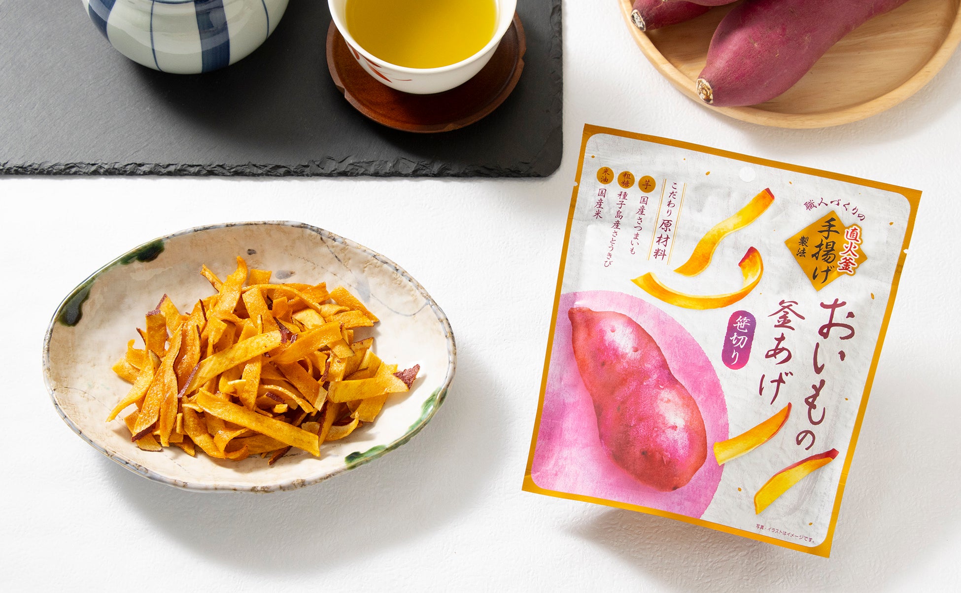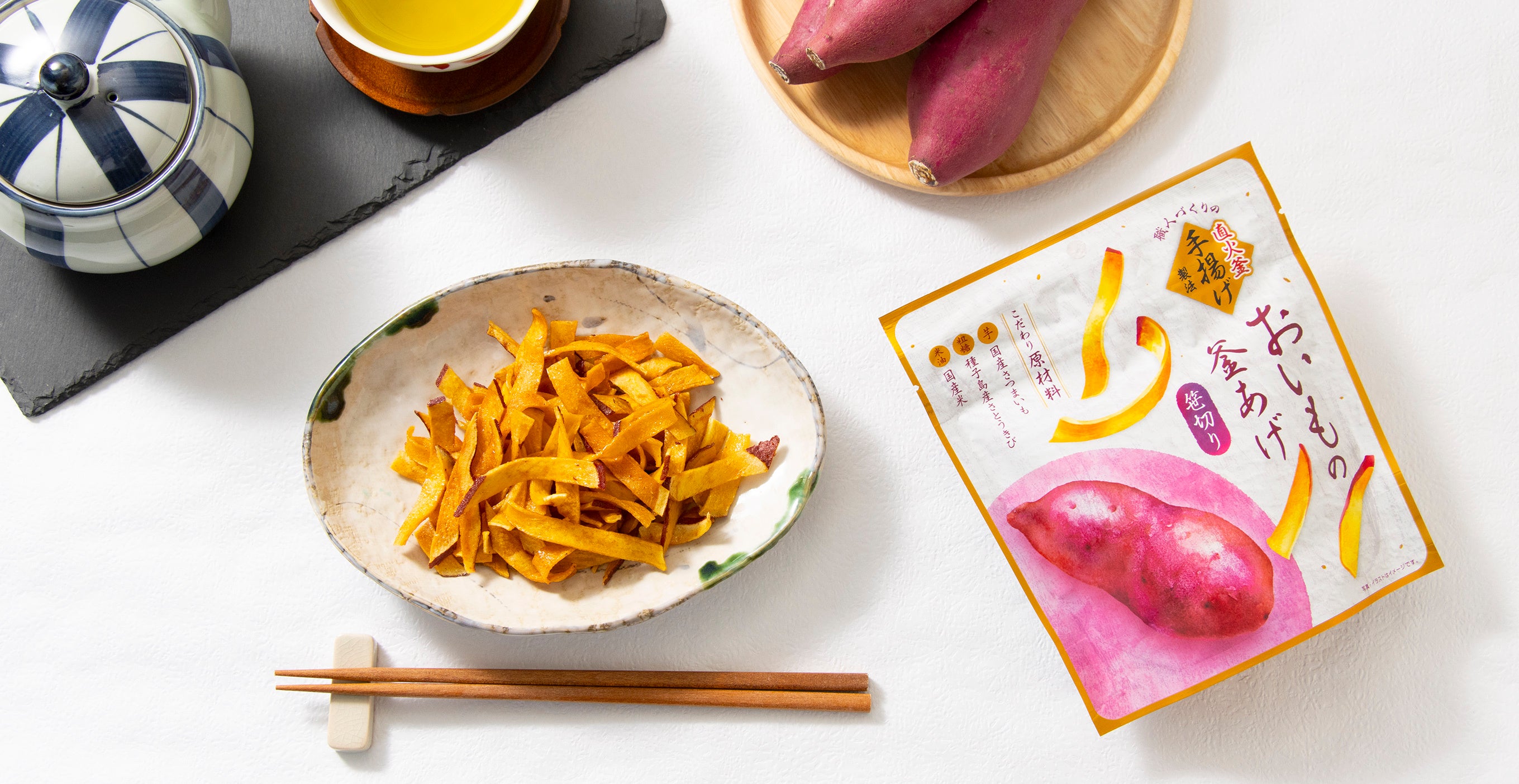 本製品は、3つの原材料からできた素朴なさつまいも菓子になります。さつまいもは繊維に沿って薄くリボン状にカットする笹切りタイプで、手に持ちやすく、サクサクと食べることができる独特な食感となっています。