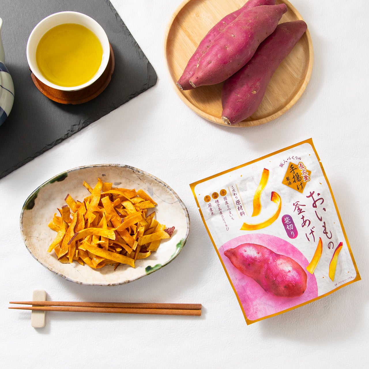 さつまいもの本来の味を生かすため、くせの少ない米油で揚げ、粗糖でほんのりやさしい甘味になるように仕上げています。