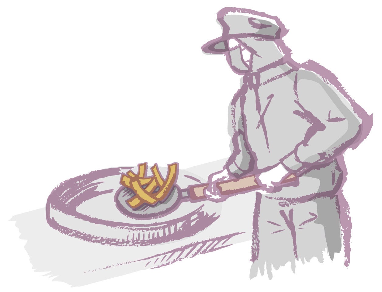 フライ方法は、機械化が進む中あえて伝統的な「直火釜手揚げ製法」にこだわりました。 「直火釜手揚げ製法」は、伝統的な製法の一つで、フライ釜を直火で加熱し、職人がさつまいもの状態を確認しながら温度と時間をコントロールし、最適なタイミングで引き揚げることができます。