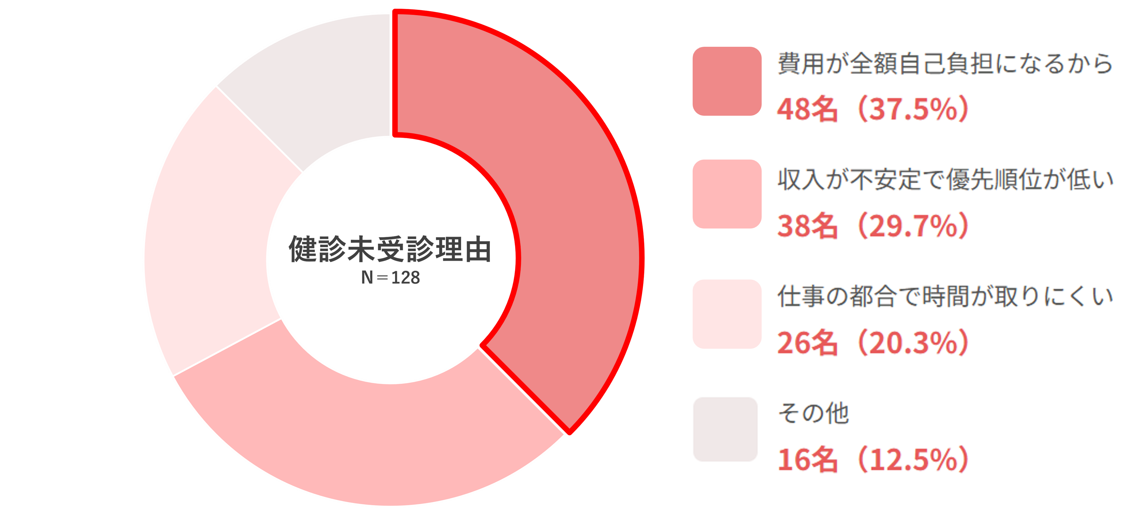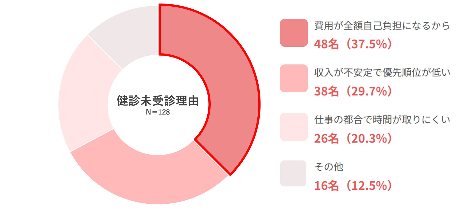 また、健康診断や人間ドックを「受診したことがない」と回答した女性に、受診しなかった理由を問うと「費用が全額自己負担になるから」(48名、37.5%)が未受診理由トップの回答となりました。次いで「収入が不安定で優先順位が低い」(38名、29.7%)、「仕事の都合で時間が取りにくい」(26名、20.3%)と続き、会社員時代のように健診の義務がない中、全額自己負担という経済的ハードルが大きな壁となっています。また、フリーランス転身後に37%が「収入が下がった」と回答しており、経済的な厳しさがある中で、健診に投資する方が少ないという現実が垣間見えました。