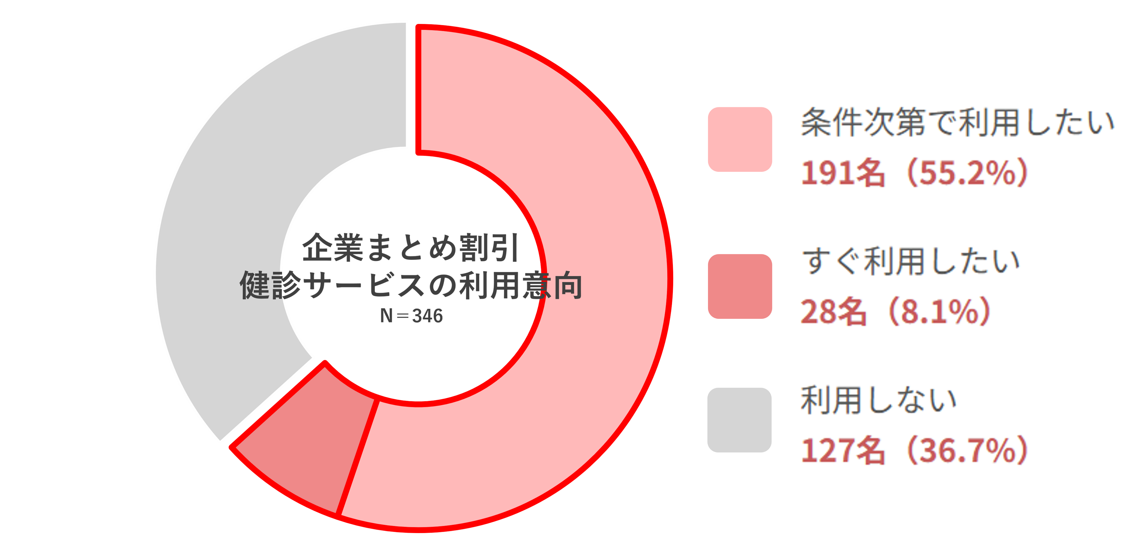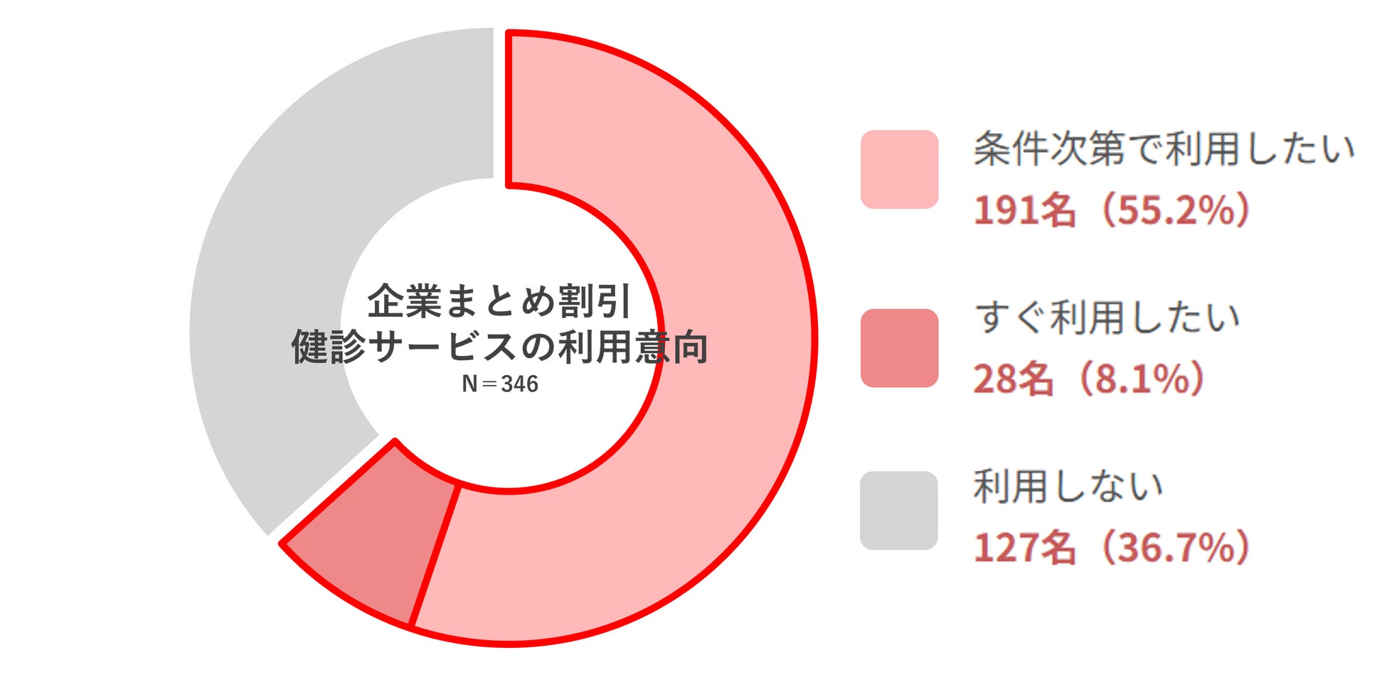 「企業がまとめて申し込む形(割引あり)の健診サービスがあったら利用したいか」という問いに対し、63.3%が利用意向を示す「条件次第で利用したい」55.2%「すぐ利用したい」8.1%希望する検診項目は「一般健診」(245名)、「生活習慣病検査」(146名)、「子宮がん検診」(144名)、「乳がん検診」(135名)