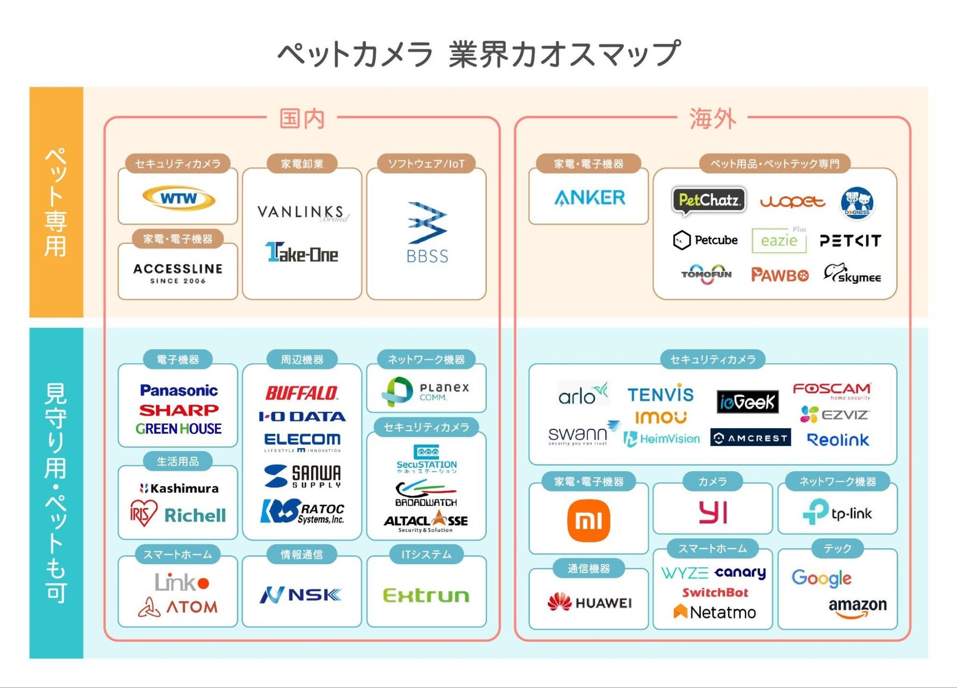 このカオスマップで、さまざまな業種の企業がペットカメラにも参入していることがわかります。